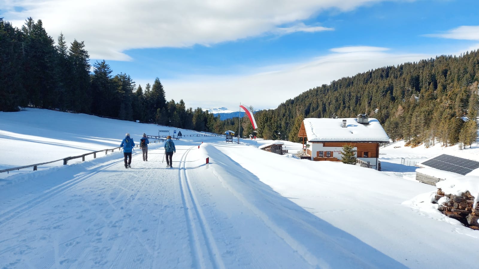 Difficile sbagliare: da qui parte solo una strada, in inverno appunto coperta di neve. Superflue anche le ciaspole, essendo la strada ben battuta per gli sciatori di fondo. Se proprio potrebbero essere utili nel ritorno nel caso in cui la neve tendesse ad essere un po’ più morbida.
