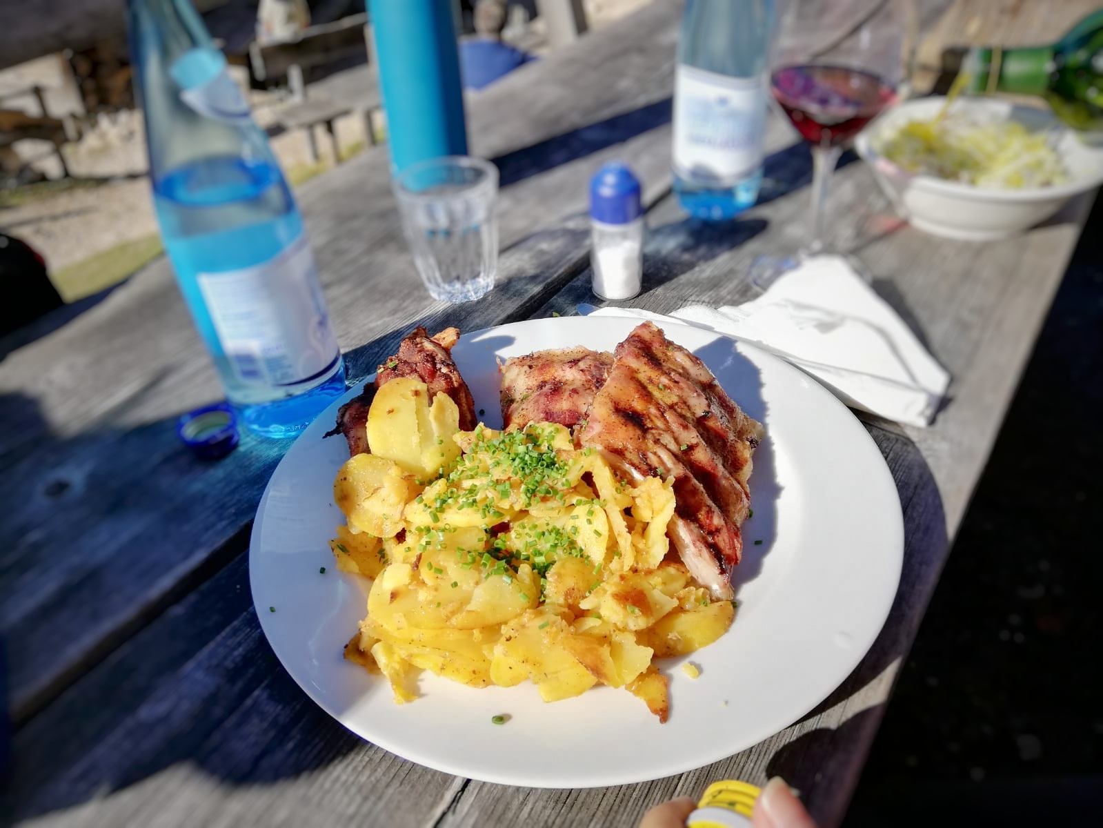 Questa volta abbiamo optato per un pranzo al sacco seduti sotto queste cime spettacolari, ma la volta scorsa abbiamo mangiato dei canederli buonissimi, incredibili costine e dolci appena sfornati! I tavoli sono disposti sul prato ai piedi di questi monti che ci sovrastano con la loro maestosità.
