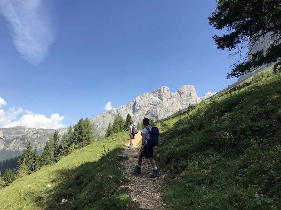 Il bosco è davvero bello e gli alberi maestosi: piano piano ci si alza al cospetto di cime imponenti che si stagliano nel cielo blu.