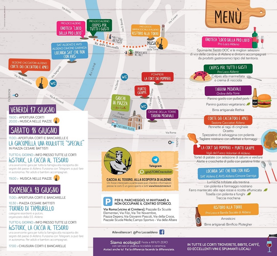 Durante tutto il giorno sarà inoltre attiva la caccia al tesoro dal sapore storico, una avvincente gara per tutta la famiglia alla riscoperta dei segreti del paese di Aldeno. Funziona con Telegram, si può fare in autonomia. Per adulti e bambini accompagnati.