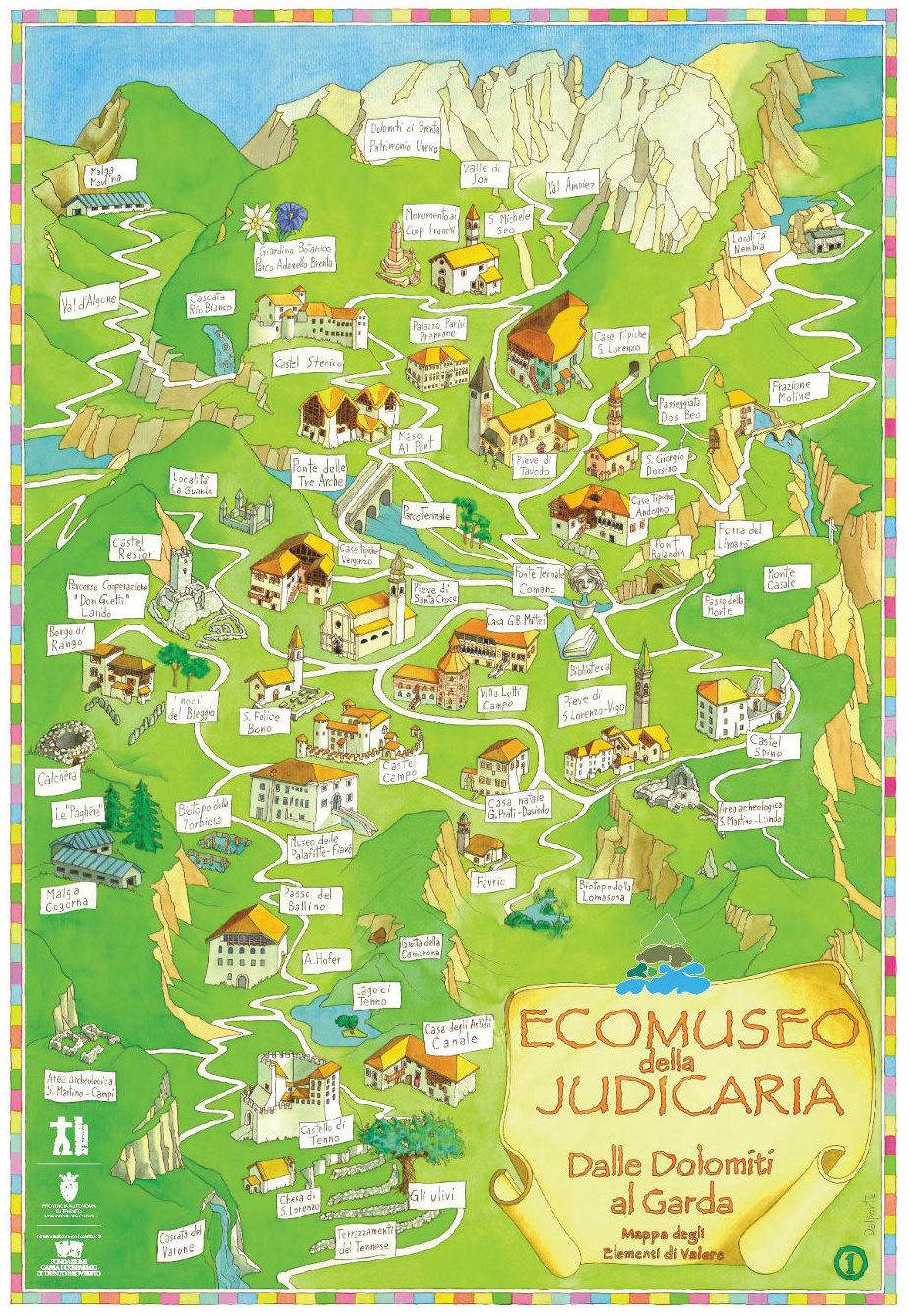 Mappa di comunità – L’Ecomuseo della Judicaria ha realizzato la prima mappa di comunità che evidenzia quelli che la comunità locale ritiene siano “elementi di valore” del territorio in cui vive. Gli elementi architettonici e naturali raffigurati nella Mappa dall’artista locale Paolo Dalponte, non sono da ritenersi esaustivi rispetto al grande patrimonio territoriale. Essi sono solo il risultato di una sintesi negoziata tra i partecipanti al percorso di realizzazione del poster, sintesi non facile visto l’enorme numero iniziale di elementi considerati.