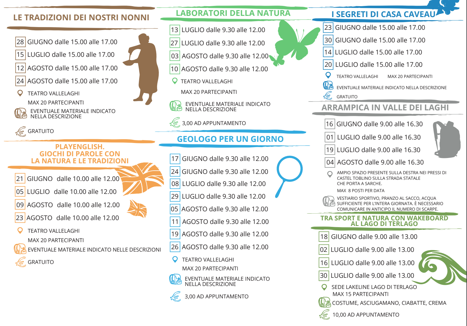 Uno degli scopi dell’Ecomuseo della Valle dei Laghi è contribuire alla formazione del sentimento di identità e promuovere più attenzione a cultura, storia, tradizioni locali, tutela dell’ambiente e valorizzazione del territorioLe attività di Ecomuseo, nascono da un lavoro in partenariato con associazioni ed esperti del territorio. Per associarsi ed iscriversi alle attività è possibile recarsi in sede (via Roma 63- Vezzano) tutti i lunedì ed i giovedì dalle 15.30 alle 18.30 a partire da lunedì 27 maggio fino ad esaurimento posti. Di seguito tutte le attività per l’estate: