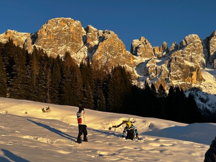 Il paesaggio ci ha lasciati senza parole, con gli alberi innevati e una soffice coltre di neve fresca appena caduta, mentre i raggi del sole penetravano tra i rami creando scintillanti giochi di luce. In meno di un’ora siamo sbucati sui prati che circondano Malga Venegia. Ci siamo quindi spostati sul retro della malga, proprio davanti alle meravigliose Pale. I bambini hanno avuto tempo di giocare sulla neve, rotolarsi, lanciarsi, fare pupazzi. Noi grandi invece ci preparavamo ad ammirare lo spettacolo dell’enrosadira in questo teatro d’eccezione. Finché eccole, le Pale tingersi di rosa ed arancione, contro un cielo limpidissimo dopo tanti giorni di nuvole.