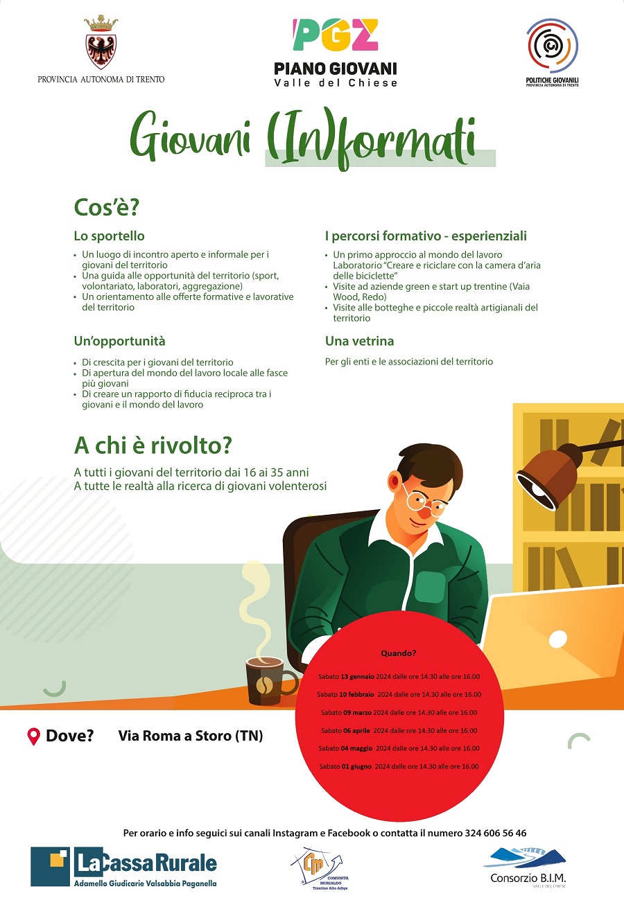 Dove: presso la sede del centro L’Arca di Storo (QUI maggiori info) e presso il centro di aggregazione giovanile di Pieve di Bono (QUI maggiori info)- Quando: sportello mensile attivo di sabato con orario 14.30-16.00.