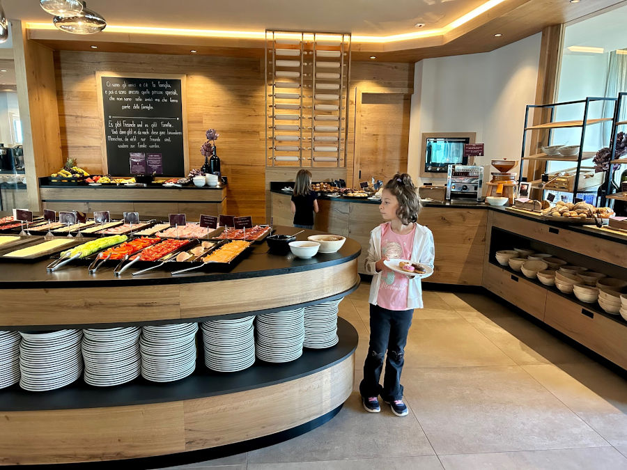 Il ristorante si trova al primo piano, proprio di fronte all’area kids e propone una ricca e ricercata cucina con ingredienti genuini, prodotti freschi regionali selezionati e attenti alla sostenibilità. La colazione a buffet sia dolce che salata spazia da una selezione di salumi e formaggi a cornetti e dolci di tutti i tipi. Non mancano le uova e i waffle cucinati a vista in diversi modi. Si possono preparare anche delle rigeneranti centrifughe con frutta e verdura.