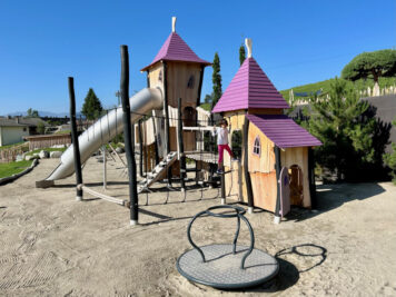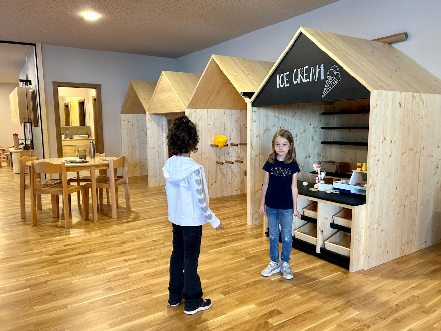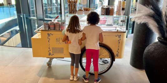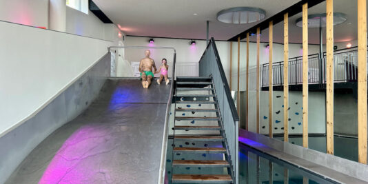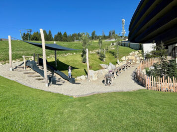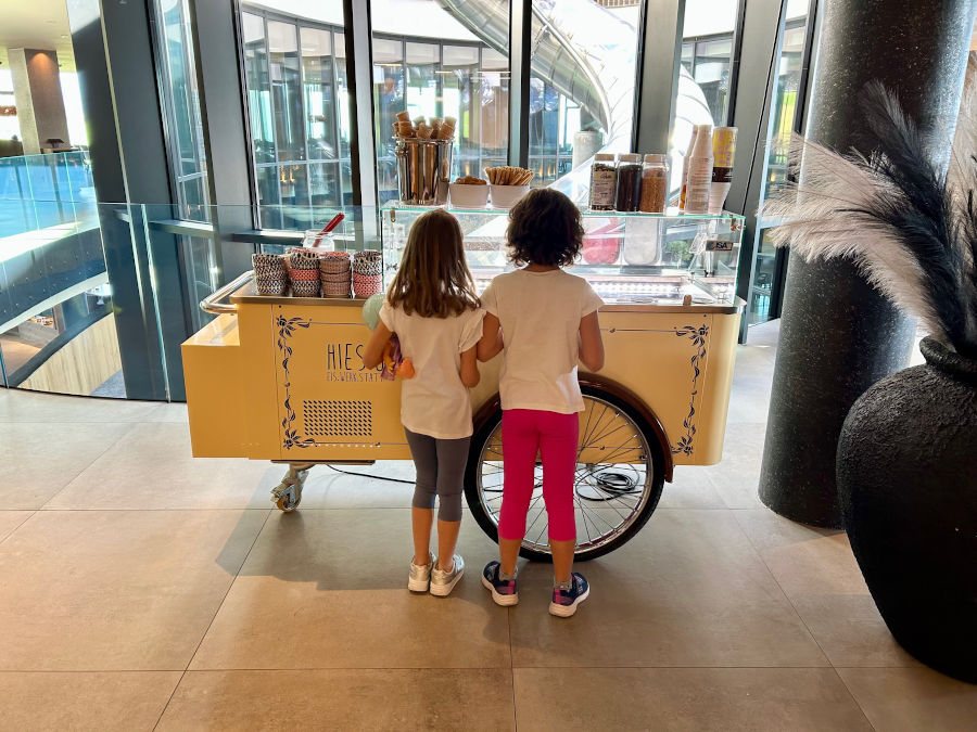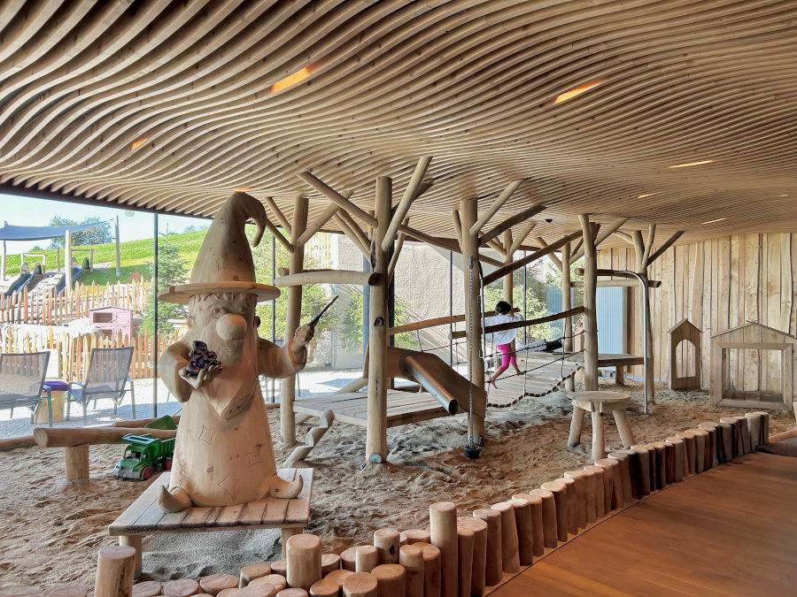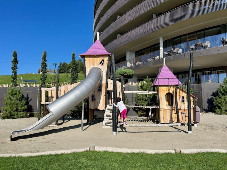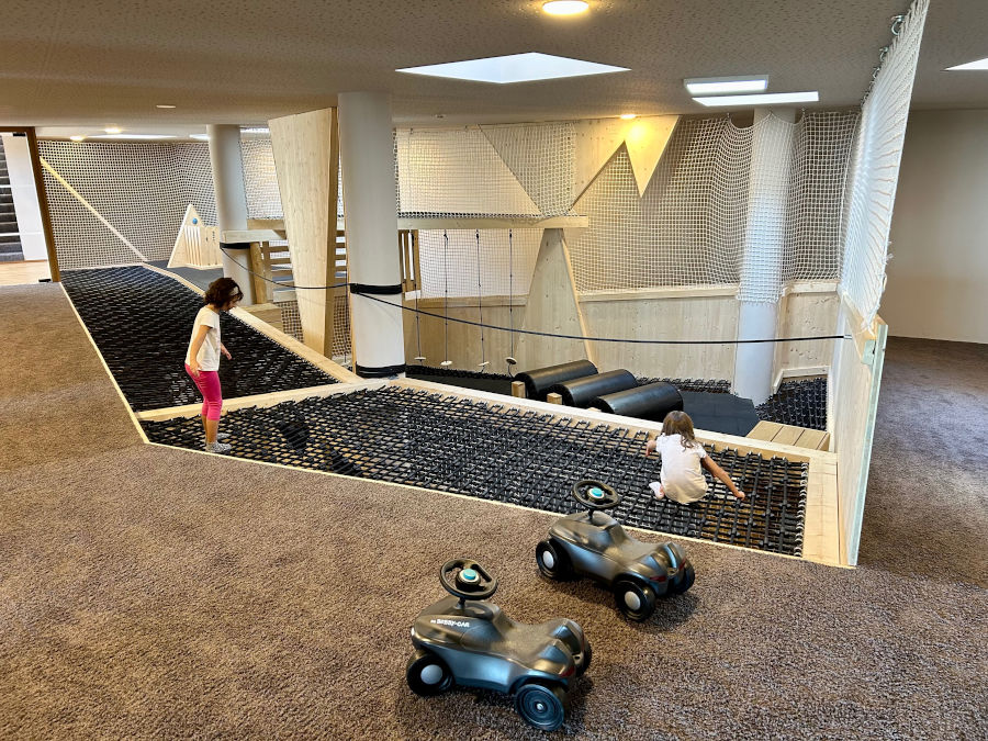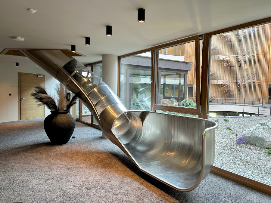Il divertimento si trova ovunque: dentro e fuori dall’hotel! Avete letto bene, anche all’interno trovate un parco giochi e tantissimi scivoli che collegano i piani dell’albergo. Ma andiamo con ordine: all’ingresso c’è un area per bambini con una costruzione in legno pensata per arrampicarsi e giocare con la sabbia. Di fianco dei tavolini con costruzioni, giochi ed esperimenti.