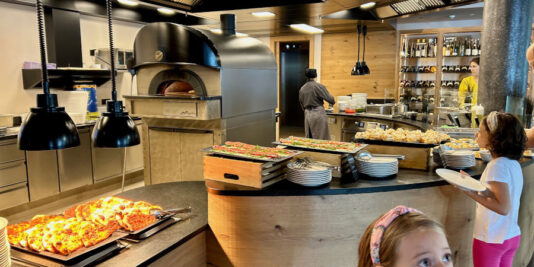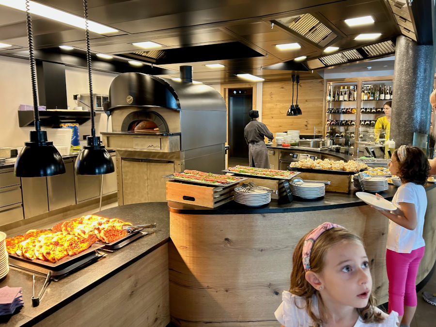 Il pranzo a self service è molto comodo, soprattutto quando i bambini scalpitano per tornare in piscina. Un ricco buffet di antipasti, insalate, formaggi, piatti freddi e una cucina espressa (piatto del giorno e pasta con diversi sughi). Non mancano pizze cotte al forno e patatine fritte, c’è davvero un’ottima scelta. Per i bambini (e non solo), il pasto si conclude con il carretto dei gelati: diversi gusti a scelta e un’infinità di decorazioni!