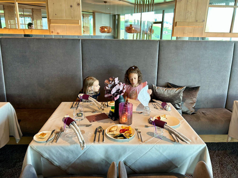 La cena viene servita al tavolo, menù gourmet à la carte di 5 portate tra specialità altoatesine, mediterranee e vegetariane. Al buffet ci sono insalate e formaggi mentre nella cucina a vista diversi antipasti e il menù bambini.