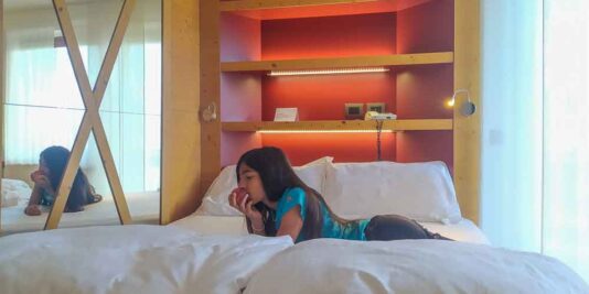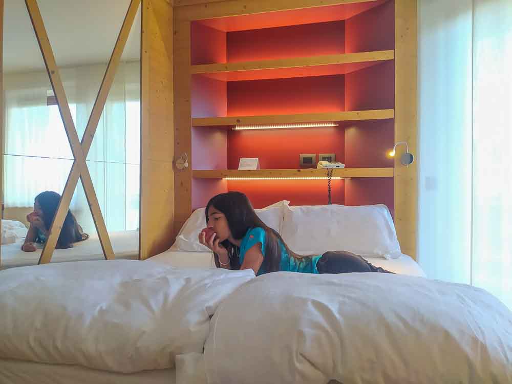 L’hotel si compone di un residence, con appartamenti indipendenti e di una struttura alberghiera. I servizi offerti sono fruibili sia da chi alloggia in formula residence sia da chi alloggia nelle stanze. Noi abbiamo provato la Junior Suite Vita Nova, perfetta per una famiglia attiva. Lo stile è moderno ma mantiene un tocco di tradizione montana grazie all’utilizzo del legno naturale. Gli spazi sono ben divisi e sfruttabili: c’è un bel balcone, una piccola zona living con una vera e propria cucina a scomparsa (completa di piastra, lavello, frigo, microonde e lavastoviglie), una zona salottino all’ingresso che si trasforma in cameretta e un bagno piccolino ma ben studiato, dove non manca nulla.