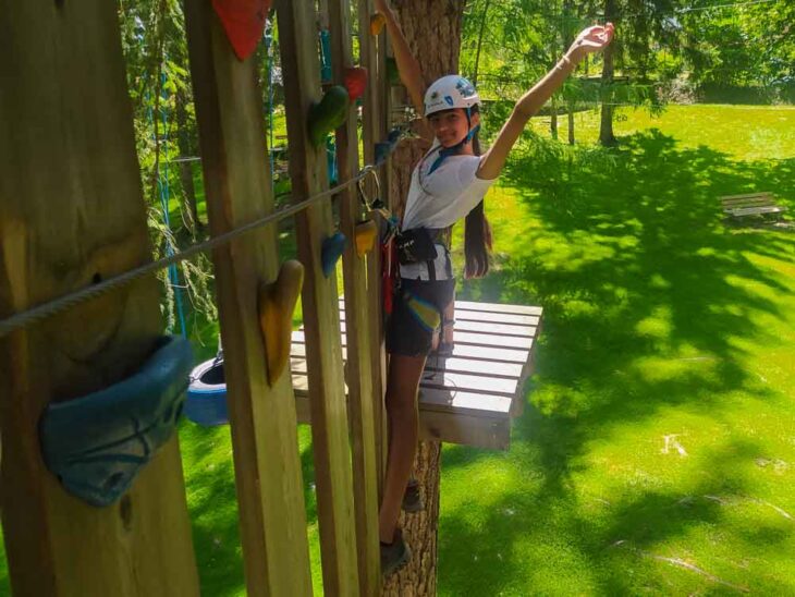 Noi siamo riuscite a provare i percorsi verdi, blu e lo zipline rosso, mentre la più temeraria ha deciso di provare anche il Powerfan: un incredibile lancio nel vuoto da un’altezza di circa 15 metri. Per effettuare questo lancio è necessario cambiare l’imbrago con uno specifico per questa attività. In seguito si sale su una piattaforma sull’albero e… ci si lascia cadere nel vuoto! Vi fa paura solo a sentirlo descrivere? In realtà l’elastico garantisce una discesa piuttosto soft, tanto che questa attrazione è aperta anche ai ragazzini. A patto che pesino più di 20 kg e siano sufficientemente coraggiosi!