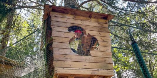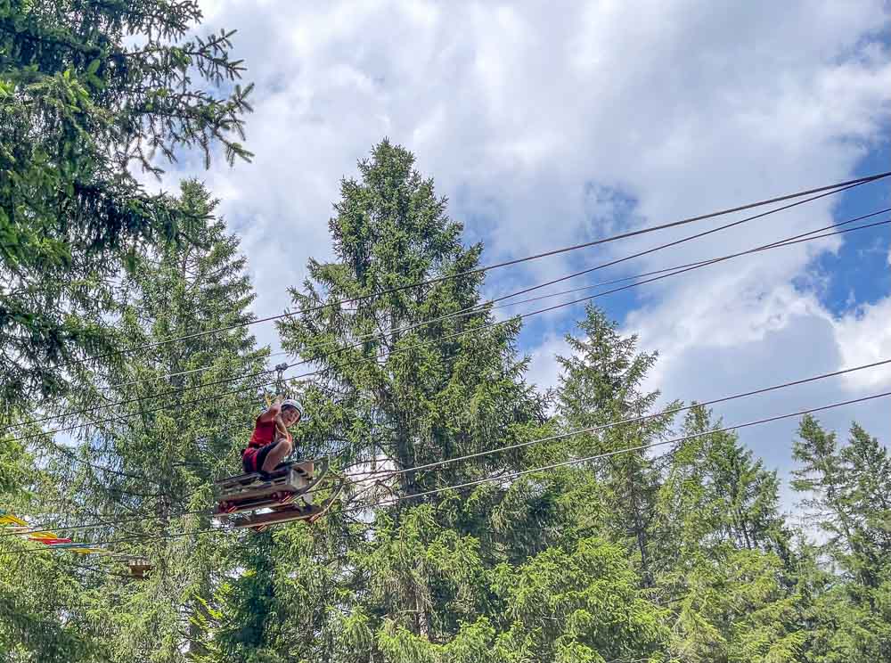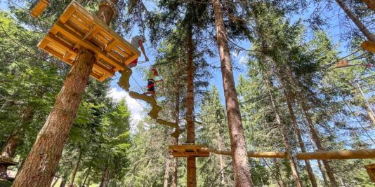 Il Forest Park è un parco avventura proprio sopra il paese e il lago di Molveno, sull’altipiano del Pradel. Ci si arriva con un’emozionante salita in telecabina, aperta dal 12 aprile al 2 novembre 2025 (orari e prezzi sempre aggiornati QUI) che regala uno splendido panorama. Oppure in un’ora circa di passeggiata di media difficoltà da Andalo o da Molveno. Apertura parco avventura 2025: