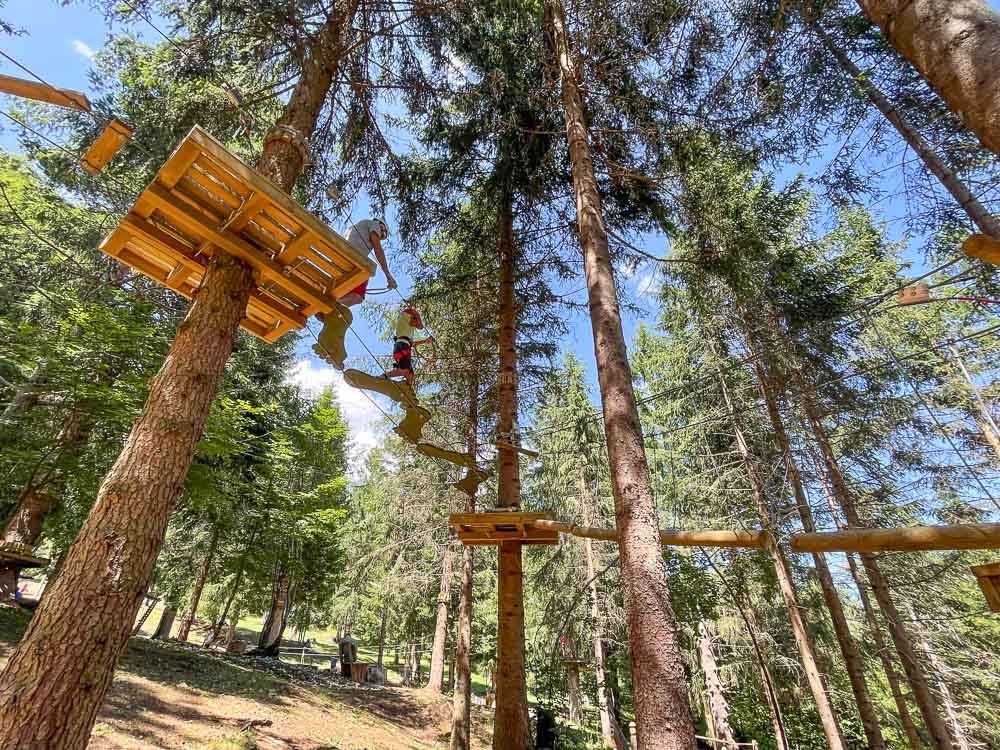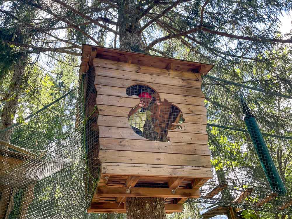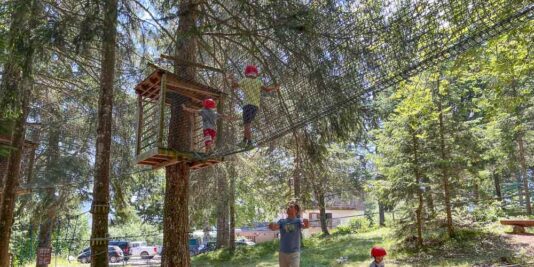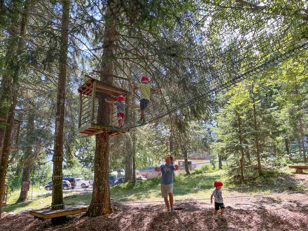 L’area per i bambini è stata ampliata con la creazione di percorsi con casette in legno protetti da reti. Bellissima anche la nuovissima Tana di Sciury dove potranno saltellare, arrampicarsi e sperimentare il proprio equilibrio. In questa zona riservata ai più piccoli occorre indossare solo caschetto dato in dotazione e senza imbrago, possono sperimentare l’altezza senza pericoli, sarà emozionante essere sospesi a qualche metro da terra (si va da passaggi a mezzo metro da terra fino ad arrivare a postazioni alte qualche metro).