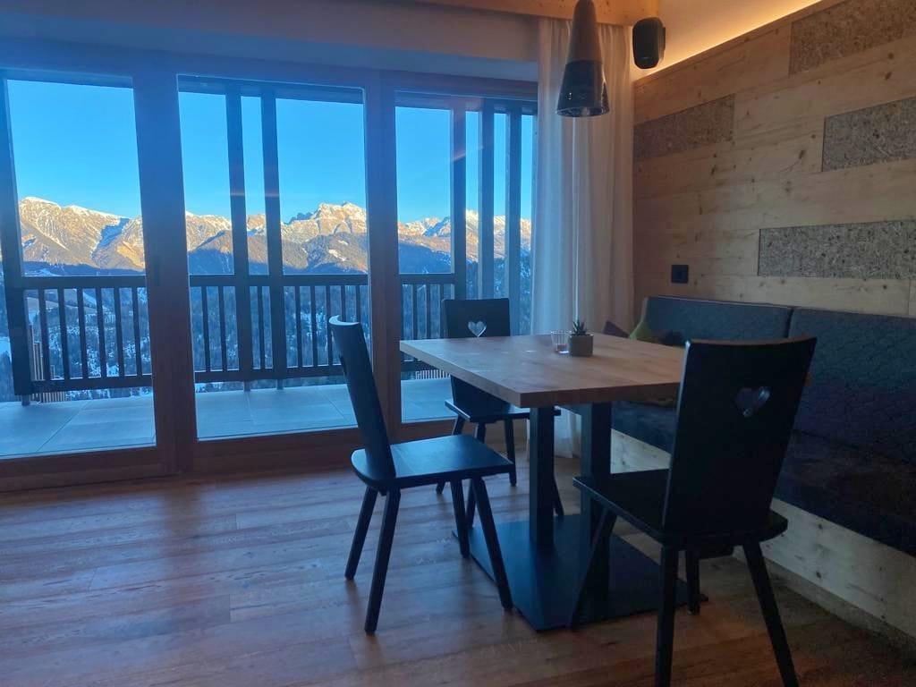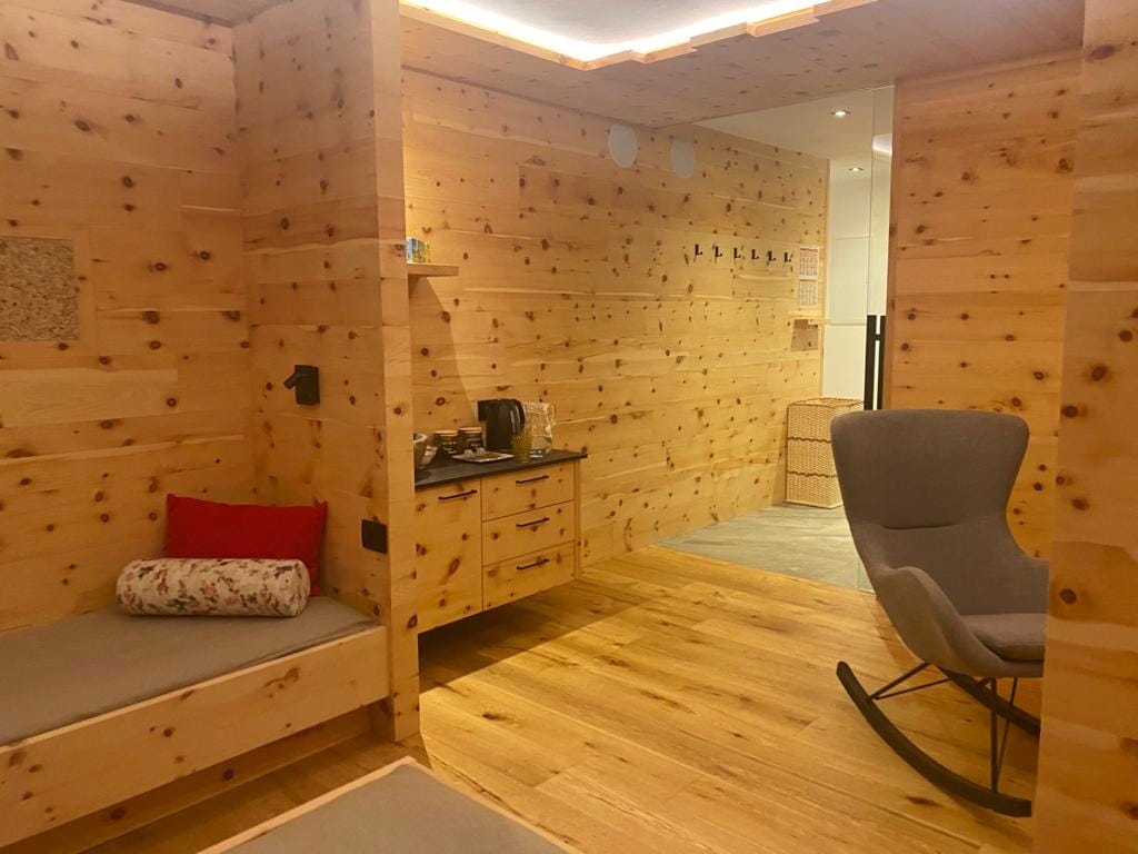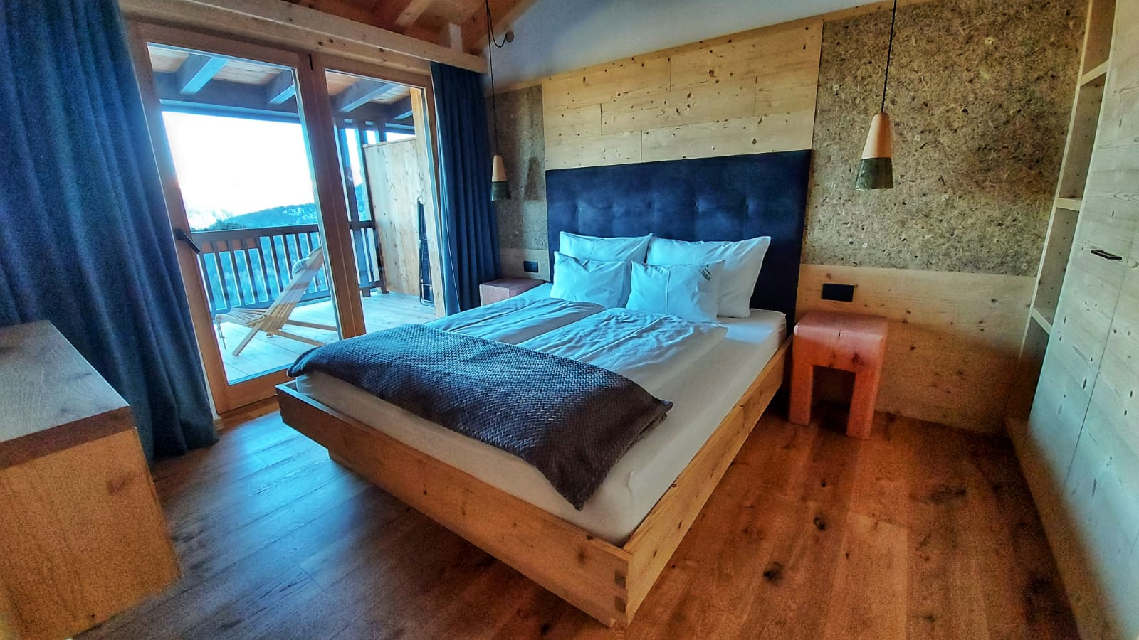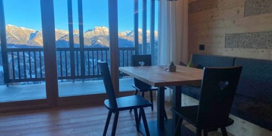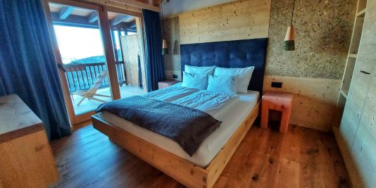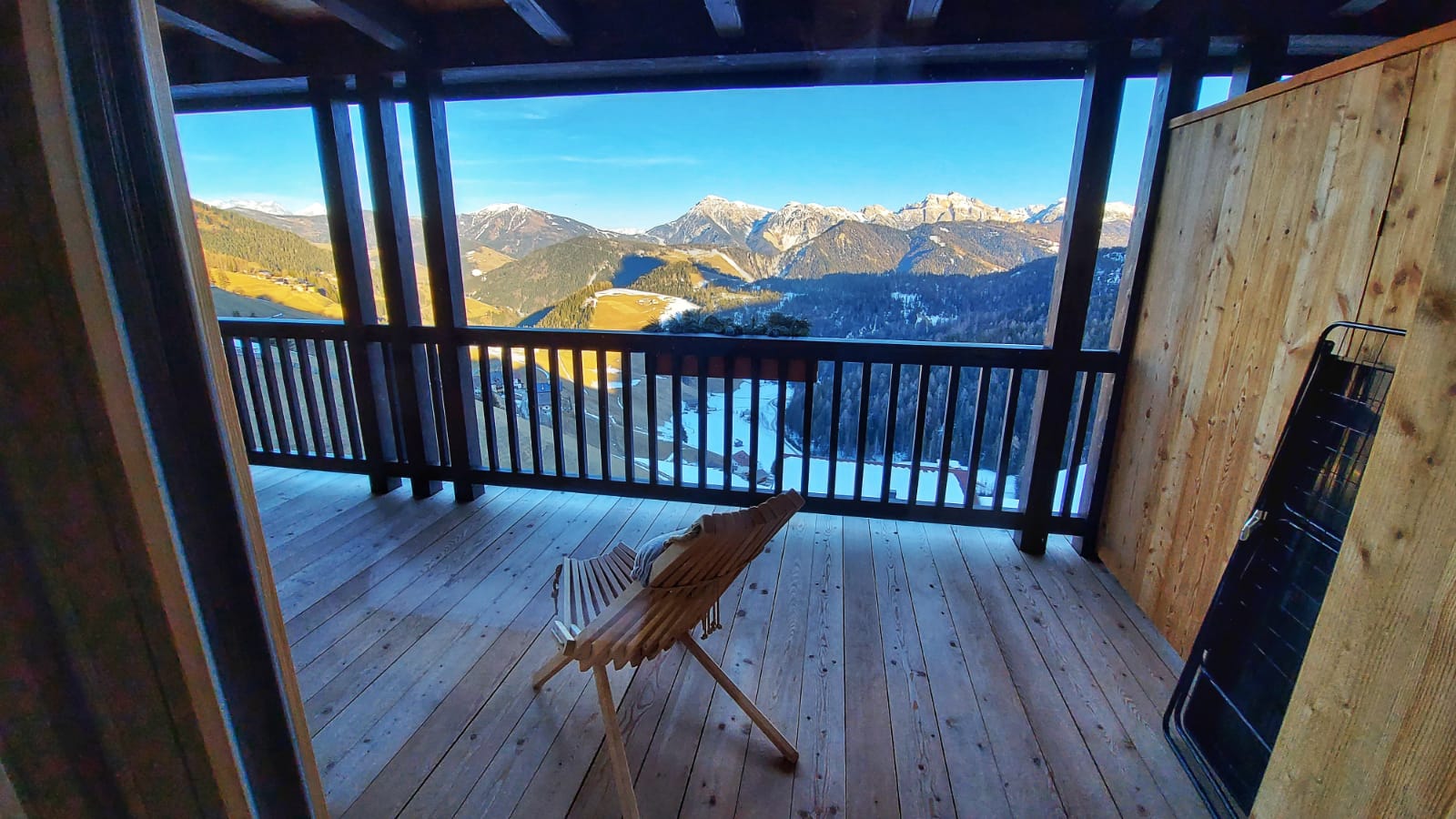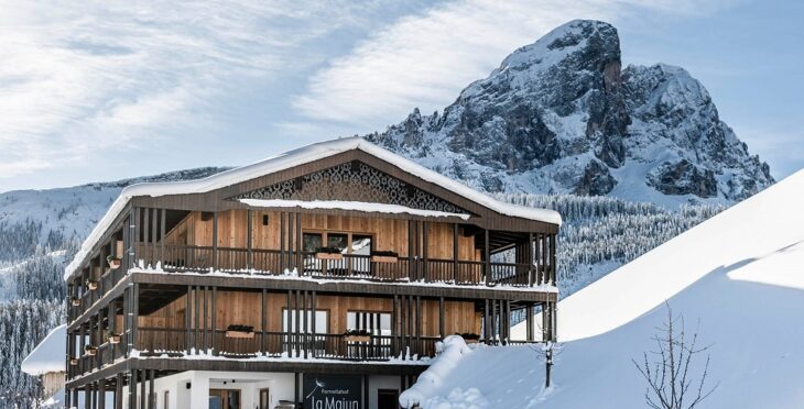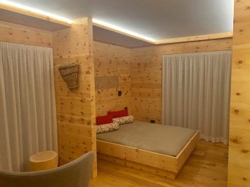 Cinque gli appartamenti, funzionali ed eleganti. Il tocco in più lo dà il profumo di fieno che sentirete dentro, visto che le pareti sono state realizzate con questo materiale. Il legno è di certo predominante, con un bel gioco di luci. Una curiosità: le lampade, in vetro e fieno, sono state ideate proprio da Helmut. Spettacolari i balconi panoramici, in cui si può mangiare all’aperto con la bella stagione.