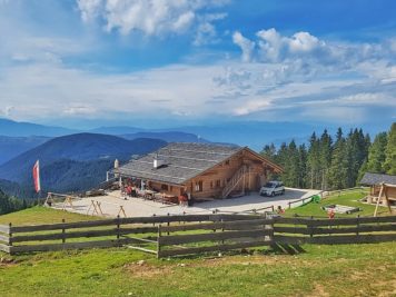 - o ancora in circa un’ora e mezza di camminata partendo dalla Frommeralm arrivare alla Malga Franzin. L’ultimo tratto per raggiungere la malga (dal parcheggio Climbing Rock) è sulla strada. Nei prossimi anni sono previsti dei lavori che permetteranno di raggiungerla più comodamente. Malga moderna e curata con diversi tavoli e divanetti all’esterno, dolci deliziosi, una piccola sabbiera e scivolo per i più piccoli.