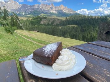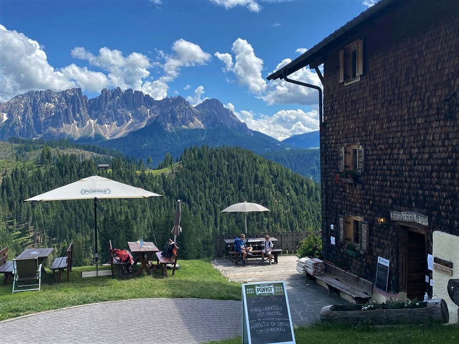 - oppure andare in un’ora (e 300 metri di dislivello) alla nostra amata Malga Haniger, proprio sotto le Torri del Vajolet. Qui si mangiano ottimi canederli e tante altre prelibatezze.