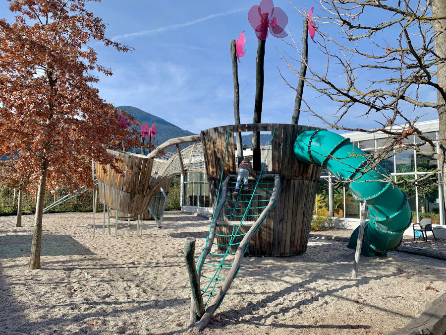 E per finire tutti al parco giochi! All’esterno ci sono due grandi strutture a forma di vasi di orchidee con scivolo, ponte, scale e reti d’arrampicata.