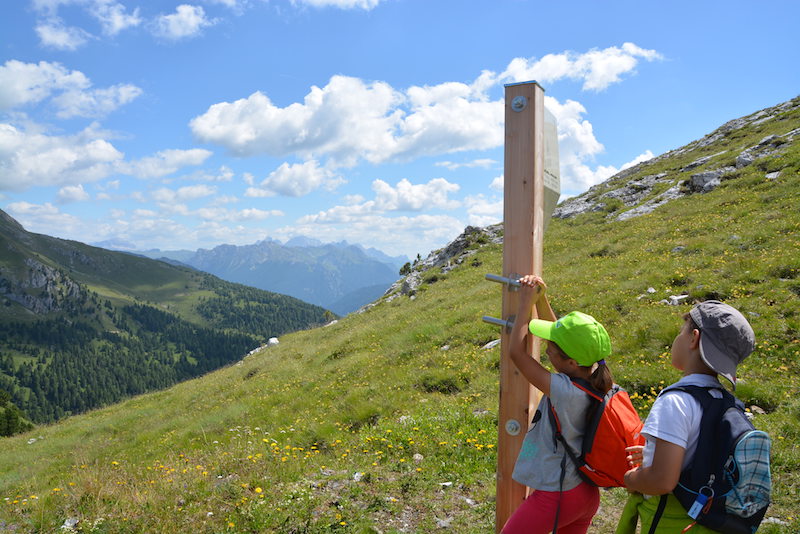 Proprio sul cucuzzolo del Dos Capél, un anello in acciaio nel cui centro i bambini potranno adagiarsi fungerà da mappa delle cime e vi farà sentirete praticamente al centro del mondo e a due passi dal cielo. Provare per credere.