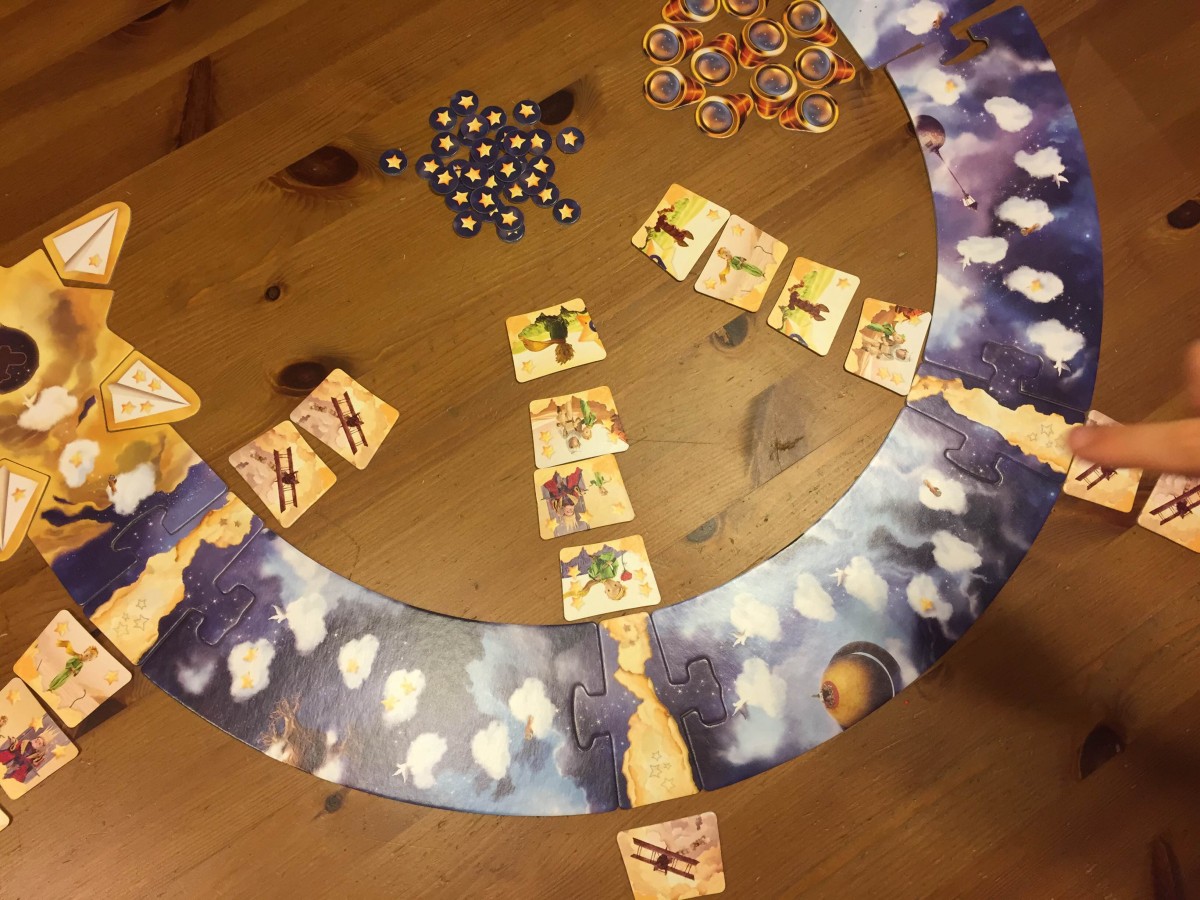 Fra qualche giorno è il compleanno del nostro Timmy e oggi è arrivato un super regalo, così bello che lo voglio condividere con voi, così “giusto” che Timmy ha pianto perché avrebbe giocato ancora e ancora. Il punto è che lui non è uno da giochi di società, ma questo ci è sembrato da subito accattivante, sarà per la bella grafica, sarà che riguarda il mitico Piccolo Principe, sempre romantico o sarà che l’obiettivo è il classico e semplice “vince chi ne ha di più”. Infatti vince chi ha raccolto, lungo il percorso, in mezzo alle nuvole, il maggior numero di stelline. Il divertimento quindi sta nel capire come fare a raccoglierle, giocando la carta migliore e decidendo, senza troppa incidenza del caso, il proprio destino. Nessuna particolare complicazione, solo qualche piccola strategia che si impara giocando. L’amica volpe e il Piccolo Principe accompagnano i giocatori senza invadere la scena e il risultato è un gioco di immediata intuizione che piacerà a tutti. Bella l’idea del tabellone a forma di volta celeste.