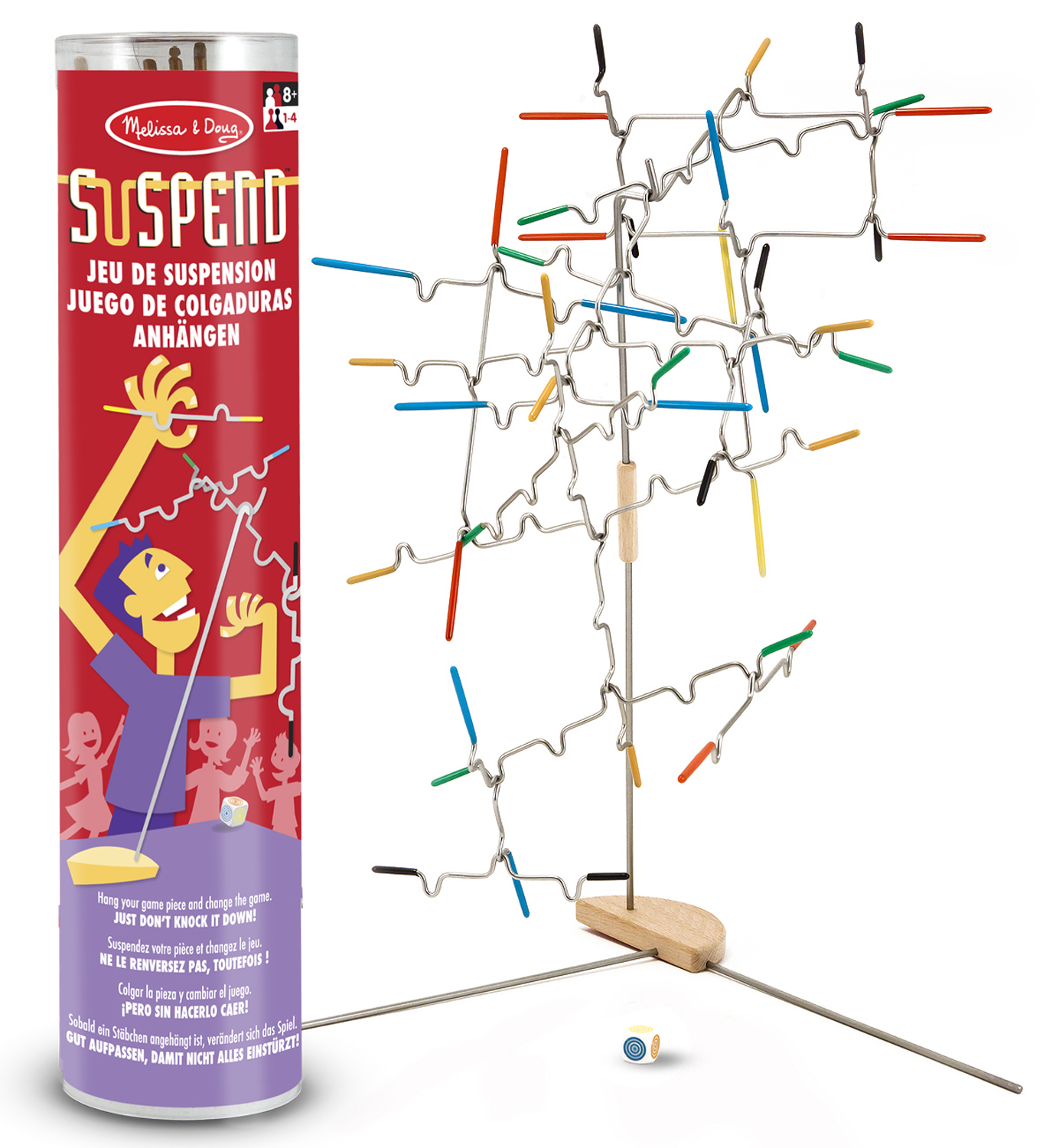 Anche del marchio Melissa & Doug vi abbiamo già svelato molte cose parlandovi di giochi per creare e costruire, vi abbiamo già detto che è un produttore statunitense che fa realizzare i suoi prodotti in Cina e che la cosa che ha colpito maggiormente Kidsonthetree è il valore educativo dei giocattoli, probabilmente ispirato dai sei figli della coppia titolare del marchio. La loro proposta a tema abilità è Suspend. Si tratta di un gioco da tavolo e di equilibrio adatto a tutta la famiglia. È un gioco di abilità e di mano ferma il cui obiettivo è quello di posizionare in equilibrio tutte le aste a partire dalla base centrale cercando di non far mai crollare la struttura il cui equilibrio cambia ogni volta che si aggiunge un’asta. Il gioco è composto da: 24 aste da gioco, 4 aste per la struttura, un dado, una base in legno e un connettore in legno.
