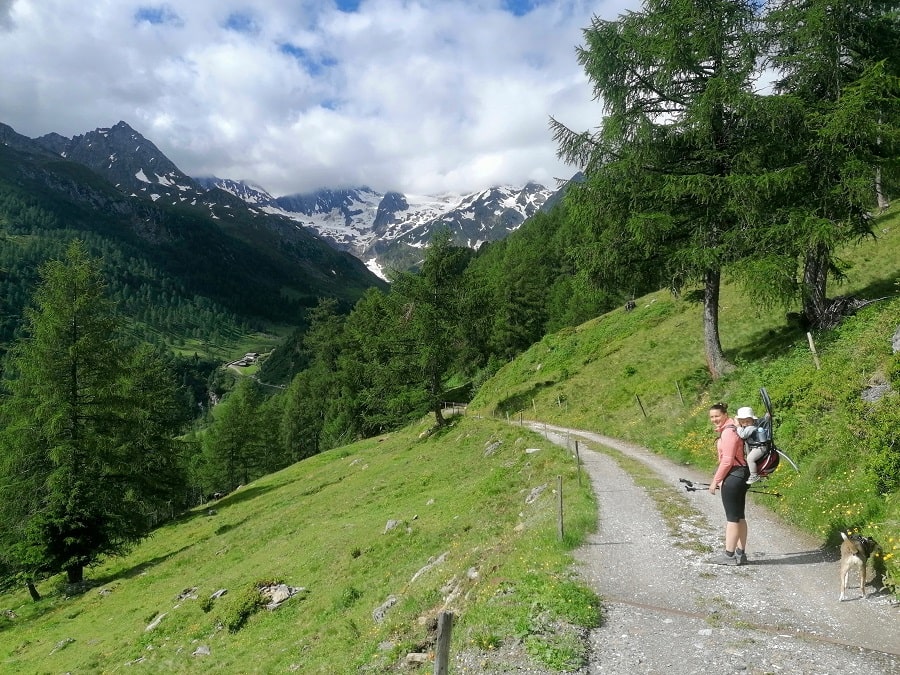 Dal paese di Moso in Passiria affrontiamo le numerose curve lungo la strada che porta a passo Rombo e, dopo una ventina di minuti, arriviamo al parcheggio della Seeber Alm, a 1900m (parcheggio libero). Prepariamo le ultime cose, carichiamo Frida sulle spalle della mamma e partiamo.