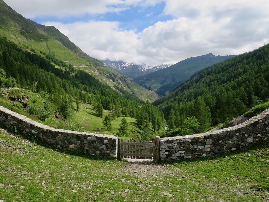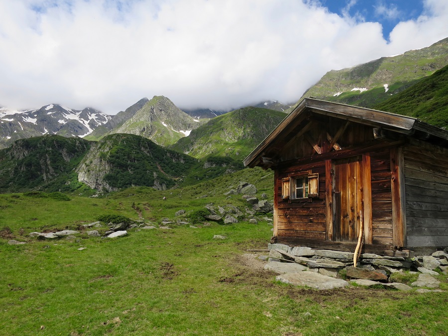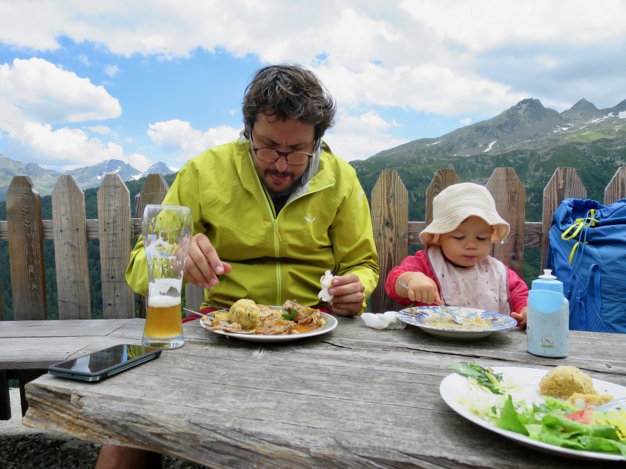Scendiamo da un comodo sentiero attraversando le numerose cascatelle che bagnano i prati e raggiungiamo,dopo altri 50 minuti, la Oberglanegg Alm a quota 2060 m (📞 348 802 4400). Questa malga è un piccolo gioiello: il cortile si affaccia sulla valle e sulle imponenti vette. Ma la vista non è l’unica cosa che apprezziamo: ottimi canederli e un gustoso capretto rendono omaggio alle nostre papille gustative e ci ripagano della fatica!