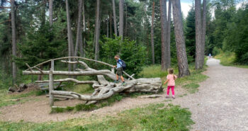 Dopo circa un’ora si arriva presso alcune case, qui una serie di frecce ci propongono di proseguire verso il Forte Tenna o Passo Borcola. Noi seguiamo quella del Biotopo Pizè che, dopo aver passato un piccolo ponte di legno, ci porta in un sentiero del bosco. Questo è il momento per i passeggini di tornare indietro: rami bassi, radici sporgenti, passaggi tra gli alberi e scalini naturali rendono impossibile l’utilizzo di un mezzo con le ruote.