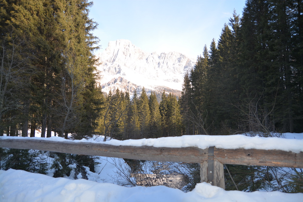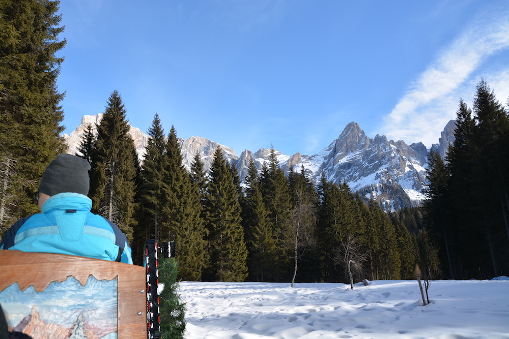 Si continua fino ad un caratteristico ponticello con spettacolare punto panoramico sulle Pale (dove vi fermerete sicuramente per fare le foto di rito), noi abbiamo affondato i piedi nella neve e ci siamo divertiti proprio a capire di che animale erano le tracce sulla neve. Risaliti in slitta, piano piano da qui si ritorna indietro.