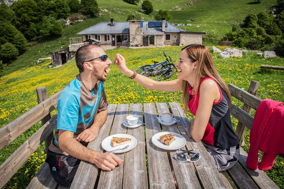 - terza tappa al Rifugio Bocca di Navene, con un succulento secondo alpino accompagnato da un calice di vino e da una vista impagabile sul Lago di Garda.