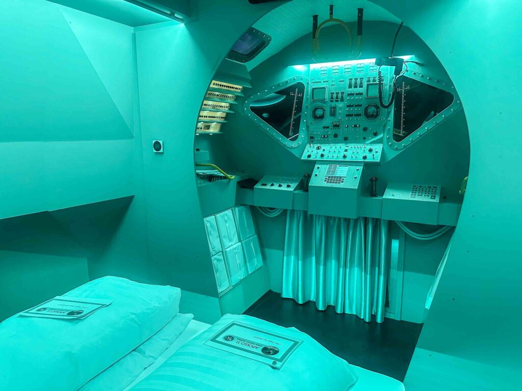 Due le capsule dove si può dormire, entrambe con due letti matrimoniali, per un totale di quattro persone. Tutti rimarranno a bocca aperta, dall’arrivo con l’ascensore dove trovi un tappeto che ti sembra di sbarcare sulla luna al corridoio che porta alla stanza, con le immagini, le spiegazioni e le date della missione. Oltre che al modellino dell’Apollo 11, usato per ricreare l’intera struttura.
