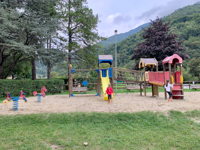 Arriviamo sul versante opposto, sulla bellissima spiaggia di Pur, che ospita un’area bambini. Altalene, scivolo, parete di arrampicata e una grande sabbiera circondati da tantissimo verde. Inutile dire che in ogni stazione ci siamo fermati per almeno mezz’ora e che ogni volta le bimbe esclamavano: “wow, questo è ancora più bello!”