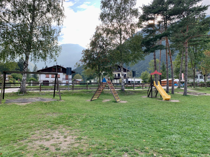 Prima di rientrare al campeggio facciamo una tappa a Bezzecca per visitare il colle di Santo Stefano. Lungo la ciclabile, circa duecento metri prima di sbucare sulla statale alle porte del paese, c’è un centro sportivo con parco divertimenti. Zona molto tranquilla e ombreggiata con maxi struttura con scivolo, arrampicata e altalene. Infine di fronte al sacrario militare c’è un piccolo parco con altalene, dondoli, scivolo e arrampicate.