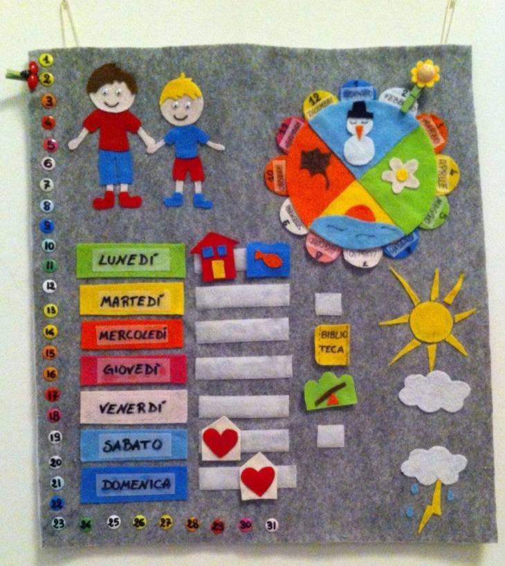 Per questo ho cercato di raffigurare, su di un pannello di feltro, un calendario con i giorni della settimana e le varie attività previste, come andare alla materna, in piscina, in biblioteca, al parco. E sabato e domenica a casa con mamma e papà. Lungo il bordo ho messo i giorni del mese, con una mollettina di legno da spostare giorno per giorno. A destra ho pensato di definire i mesi, distinguendoli in base alle 4 stagioni, in modo che fosse più semplice raffigurare i 12 mesi in base al clima (anche se ultimamente devo dire che ho visto 24 gradi a novembre e nevicare a giugno…ma mi auguro siano rare eccezioni). Ho inserito anche il tempo climatico con sole, nuvole, pioggia e saette. Infine in alto ho personalizzato il calendario raffigurando le mie due pesti.