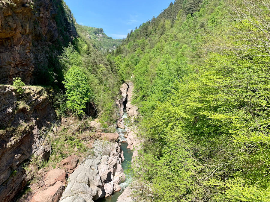 Da qui non è possibile proseguire con i passeggini, il fondo sterrato non è pianeggiante, e in caso di bimbi piccoli vi consigliamo dei marsupi da montagna. Il primo tratto, in discesa, conduce ad un ponte che attraversa la forra. Si prosegue lungo il sentiero, ora in salita, seguendo le indicazioni e si raggiunge una prima terrazza panoramica. Resterete a bocca aperta per tanta bellezza. Il rumore in sottofondo poi regala una pace assoluta.