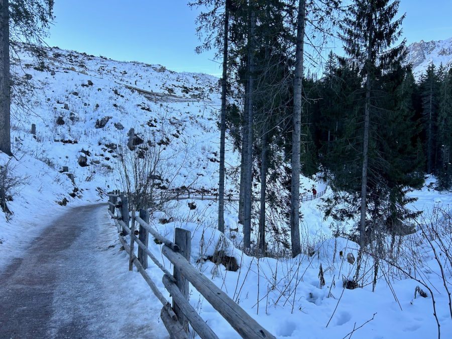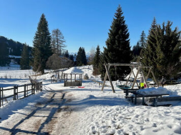 Qui non troverete indicazioni, seguite la neve battuta che sale, questo è il tratto più faticoso, prestate attenzione che la via è molto stretta! Arrivati in cima bisogna svoltare a sinistra sul sentiero principale. La strada prosegue pianeggiante e in circa quaranta minuti conduce al punto di partenza.
