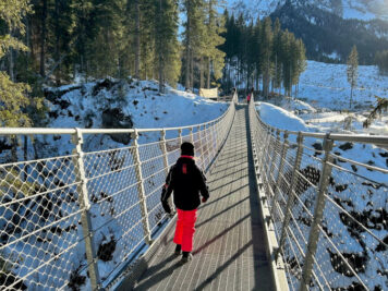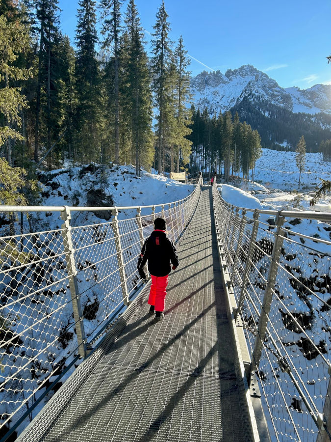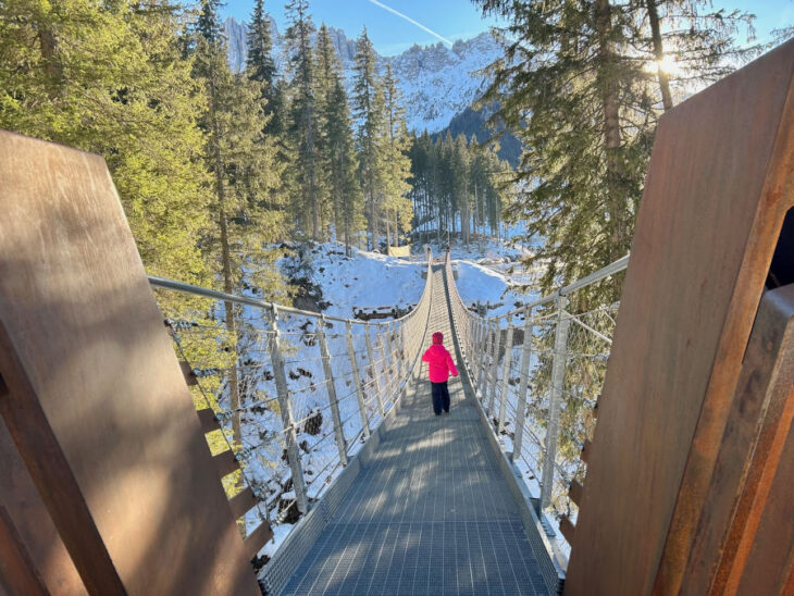 Abbiamo lasciato il camper posteggiato nel parcheggio degli impianti e proseguito verso il centro del paese. Arrivati all’altezza di un piccolo parco giochi, imboccate il sentiero che scende e seguite le indicazioni per il lago. Dopo un primo tratto lungo la strada (poco trafficata) si prosegue nel bosco fino ad arrivare ad un bellissimo ponte sospeso. Vi lascio immaginare la gioia delle piccole! Una volta attraversato ci si trova in un parcheggio, che in pochi minuti, tramite un sottopasso si raggiunge il lago. Fino a qui calcolate un’ora abbondante di camminata.