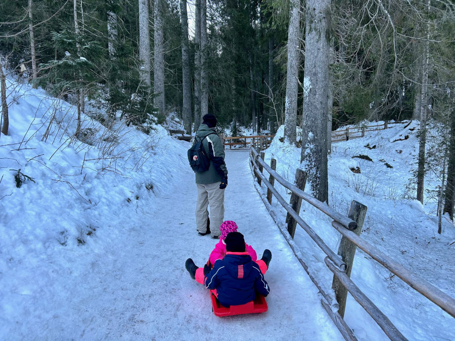 Se avete bimbi piccoli o particolarmente pigri, neve permettendo, potete trainarli con la slitta. Noi abbiamo avuto la fortuna di andarci qualche giorno dopo una bella nevicata ed è stato meraviglioso.