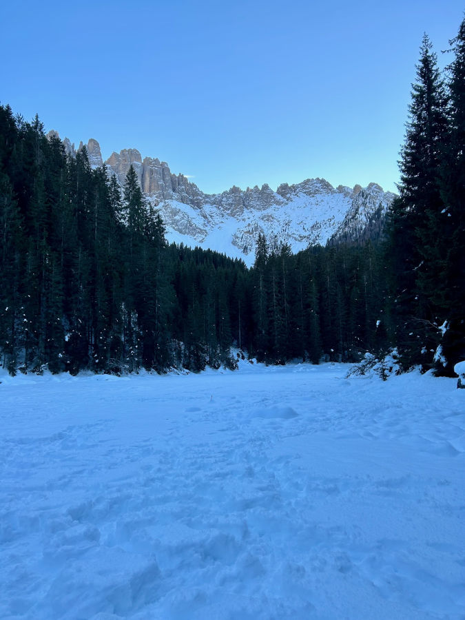 Potete percorrere il giro del lago in senso orario o viceversa, poco cambia, l’inizio del sentiero di ritorno si trova circa a metà strada. Le piccole hanno scelto di proseguire a sinistra e dopo circa venti minuti ci siamo trovati al bivio, seguite le indicazioni per il lago di Mezzo (Mittersee). Non spaventatevi la salita che vi si presenta davanti è fattibile! In nemmeno mezz’oretta vi troverete davanti un paesaggio incantevole, una radura incorniciata dal fitto bosco e dal Latemar innevato.
