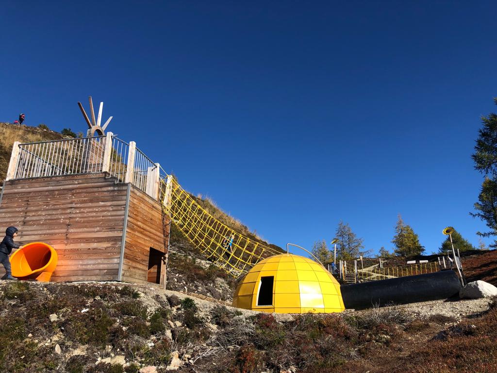 Più sotto il parco vero e proprio, altro maxi scivolo e il trono del sole con uno scivolo interno e un igloo giallo gigante in cui entrare. Si raggiunge il trono arrampicandosi su una grande rete. Un gioco da ripetere infinite volte!