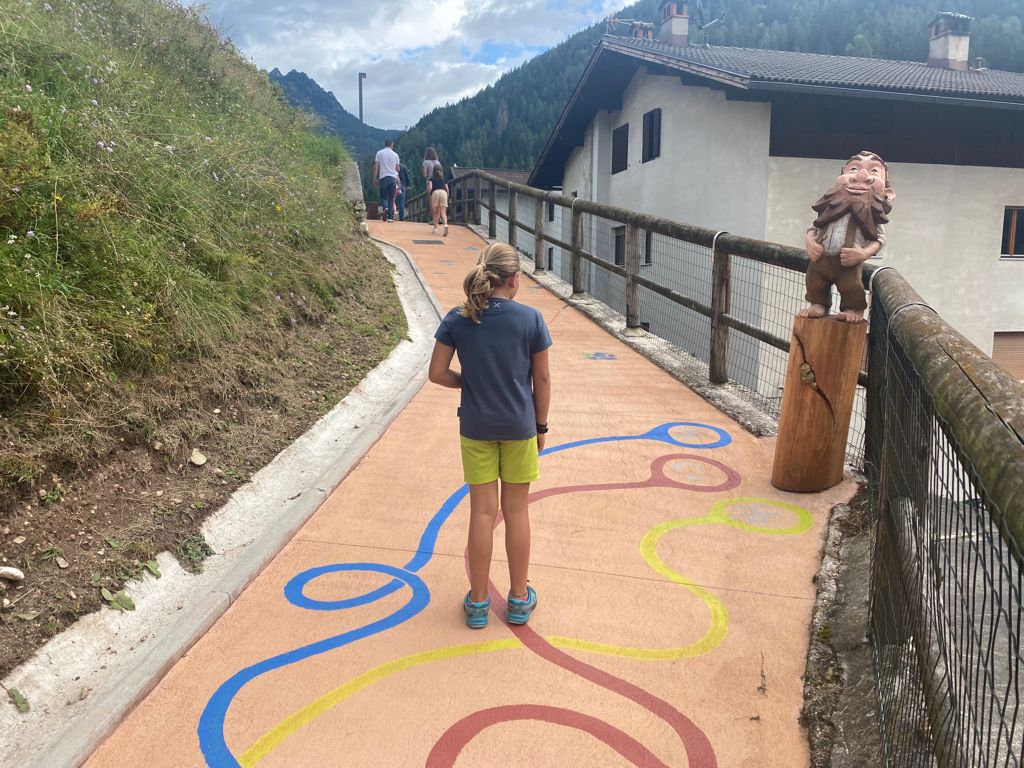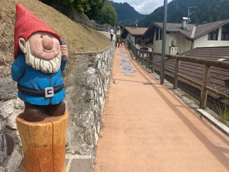 Lungo questa stradina, lunga un centinaio di metri, s’incontrano degli gnomi di legno di larice dipinto, scolpiti da alcuni artisti locali (in particolare Nicola Degiampietro, Giuseppe Zeni, Gianluigi Zeni, Nicola Zurlo e Mauro Berghi) e delle tappe ludiche: realizzate con i colori, sulla pavimentazione, permettono ai ragazzi di dare libero sfogo alla fantasia giocando in compagnia.