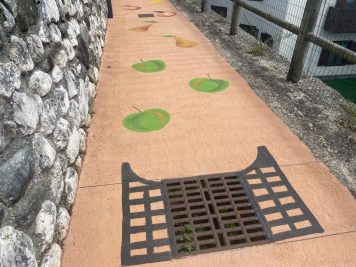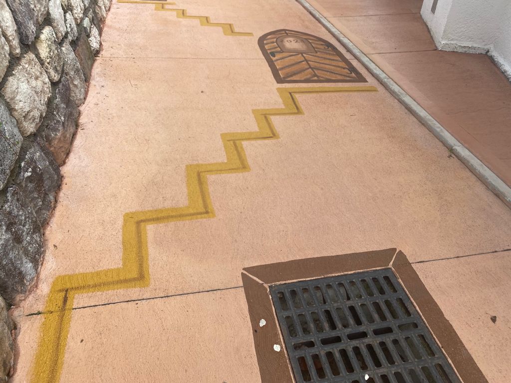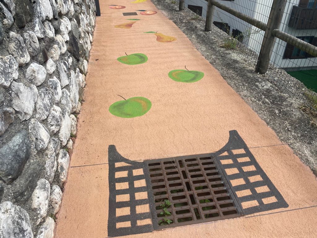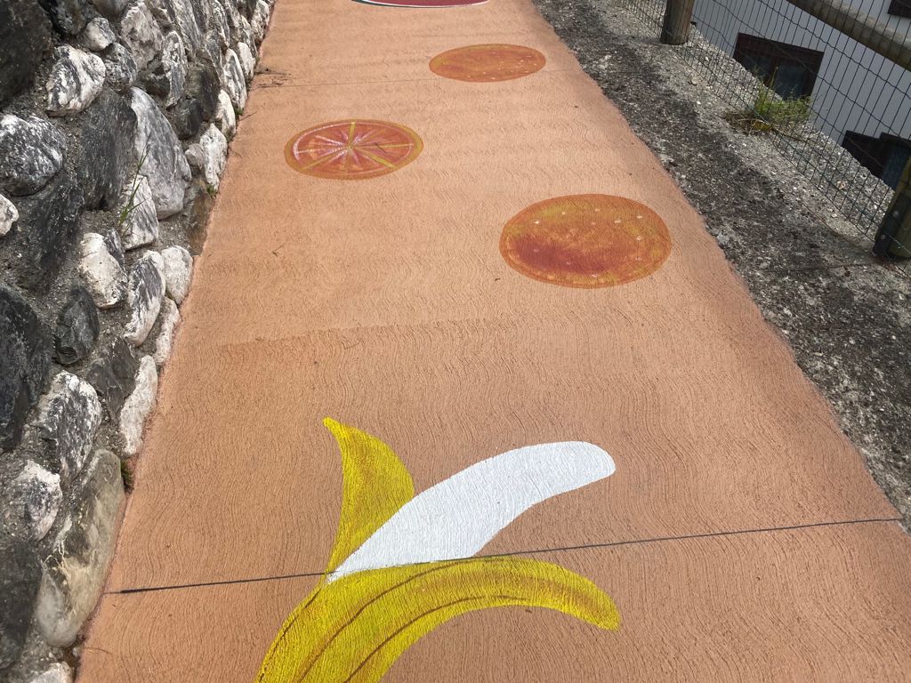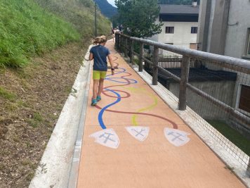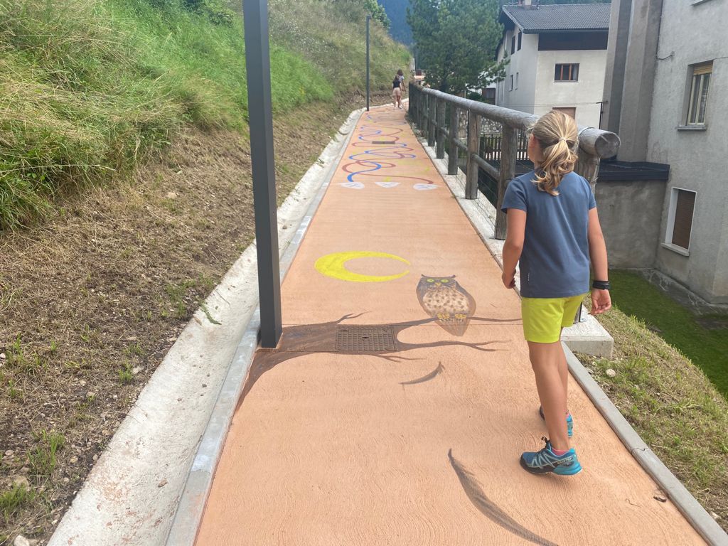 Ci sono le righe colorate da percorrere, le piume del gufo da calpestare, i giochi di una volta tipo la campana, ma anche il tombino che diventa una cassetta da cui esce la frutta e tante altre curiosità tutte da scoprire. Qui i bambini non si annoieranno di certo a camminare!