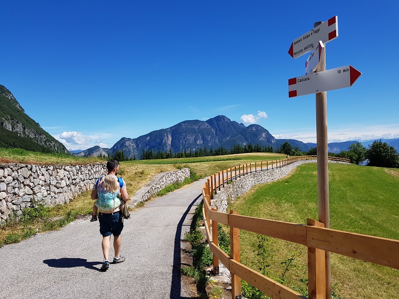 Fai della Paganella è un vero gioiellino per quanto riguarda le passeggiate a bassa quota. Sono infatti almeno cinque i sentieri tematici che partono dal centro del paese. Vi abbiamo già raccontato del Percorso dell’Otto e di quello “Acqua e Faggi“, oggi vogliamo presentarvi il Sentiero dei Reti, un tuffo nella storia e nella natura dell’Altopiano della Paganella. Il percorso è dedicato ai Reti appunto, la popolazione che viveva qui in epoca antica; lungo il percorso troverete anche le rovine di un villaggio retico originale! Adatto proprio a tutti (150 metri di dislivello in tutto) può essere percorso anche con passeggino da trekking (esclusi alcuni brevi tratti dove si deve alzare); anche se noi consigliamo di preferire il marsupio o lo zainetto da montagna. Il punto di partenza è situato in località “Capannina” dove sorge anche un bel parco giochi e un’area verde ideali per un pic-nic o una grigliata al rientro dalla camminata.