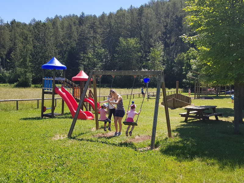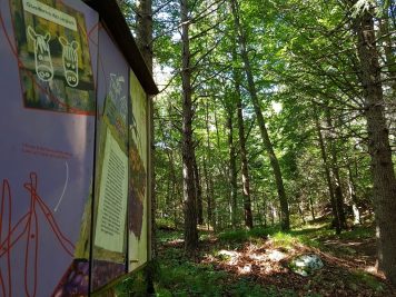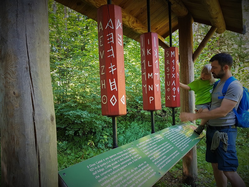 Verso la fine del percorso, quando il sentiero sta per uscire dal bosco per immergersi nelle campagne verdi di Fai, ecco le installazioni più interessanti: l’alfabeto retico (una sorta di antico google translate per decodificare la lingua dei Reti), i draghi ed il belvedere zen. Da qui con una piccolissima deviazione si raggiunge il villaggio retico: quattro ruderi benvisibili nei quali i vostri bimbi si sentiranno sicuramente come moderni Indiana Jones!