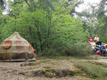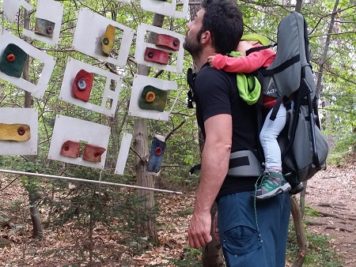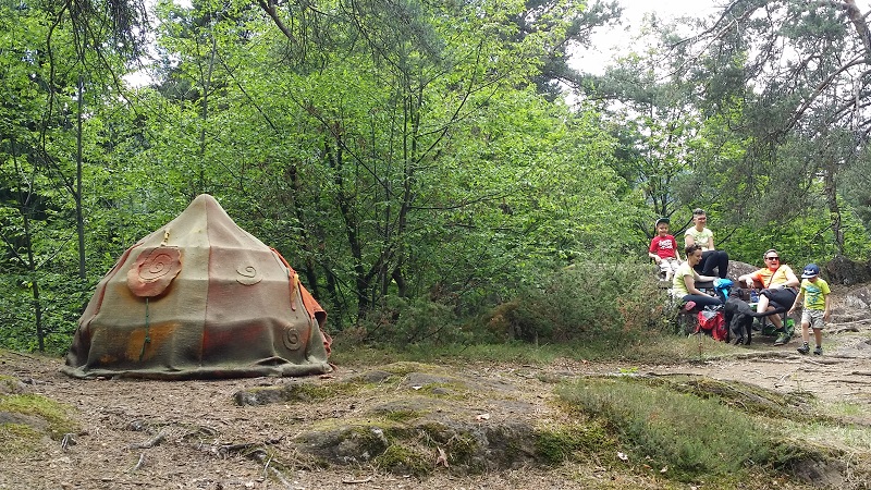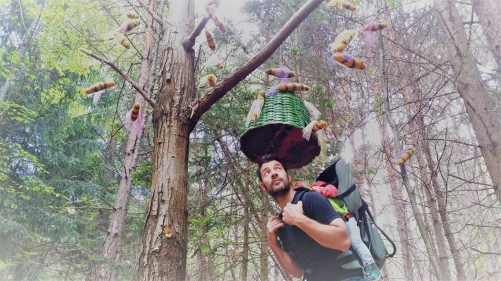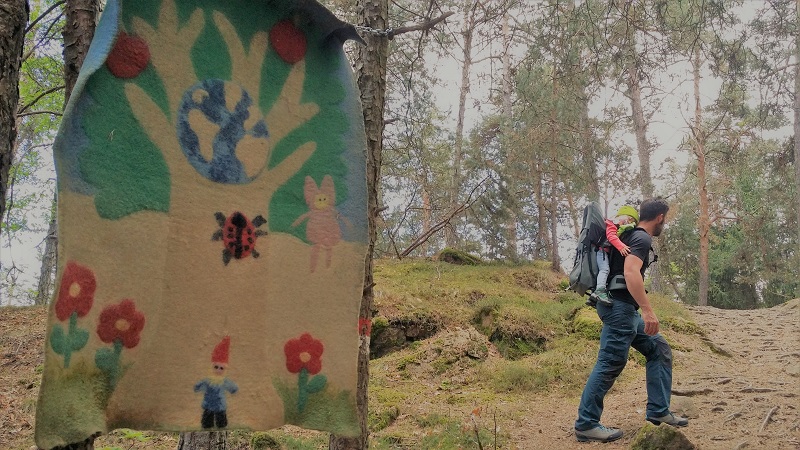 Il percorso nel suo complesso è molto carino: ben 58 installazioni in lana infeltrita (realizzate da artisti provenienti da 11 paesi diversi) si nascondono sugli alberi, tra le radure, in mezzo alla vegetazione… Anche voi, come noi e altri visitatori (stando ai giudizi letti su Tripadvisor) potreste rimanere perplessi nel constatare lo stato di abbandono di alcune opere. Qualche manufatto appare molto scolorito, a brandelli e con grossi buchi. Accipicchia, abbiamo pensato, un po’ di manutenzione in più non guasterebbe! Ma poi andando a leggere la storia del parco abbiamo capito il perchè. Il Percorso Internazionale del Feltro Artistico è nato nel 2003 seguendo un concetto fondamentale: “Venne dalla natura. Torna nella natura“. L’intento degli ideatori dunque è proprio quello di lasciar andare le opere al proprio destino, senza intervenire, facendo sì che la natura faccia il suo corso. Potete provare a spiegare questo concetto (che noi troviamo anche commovente) ai vostri figli, oppure se sono più piccoli potete semplicemente aggiungere un po’ di fantasia al racconto narrando di streghe e folletti che la notte si aggirano nel bosco per fare dispetti all’uomo (con un briciolo di immaginazione tutto diventa più fiabesco! 😉 )