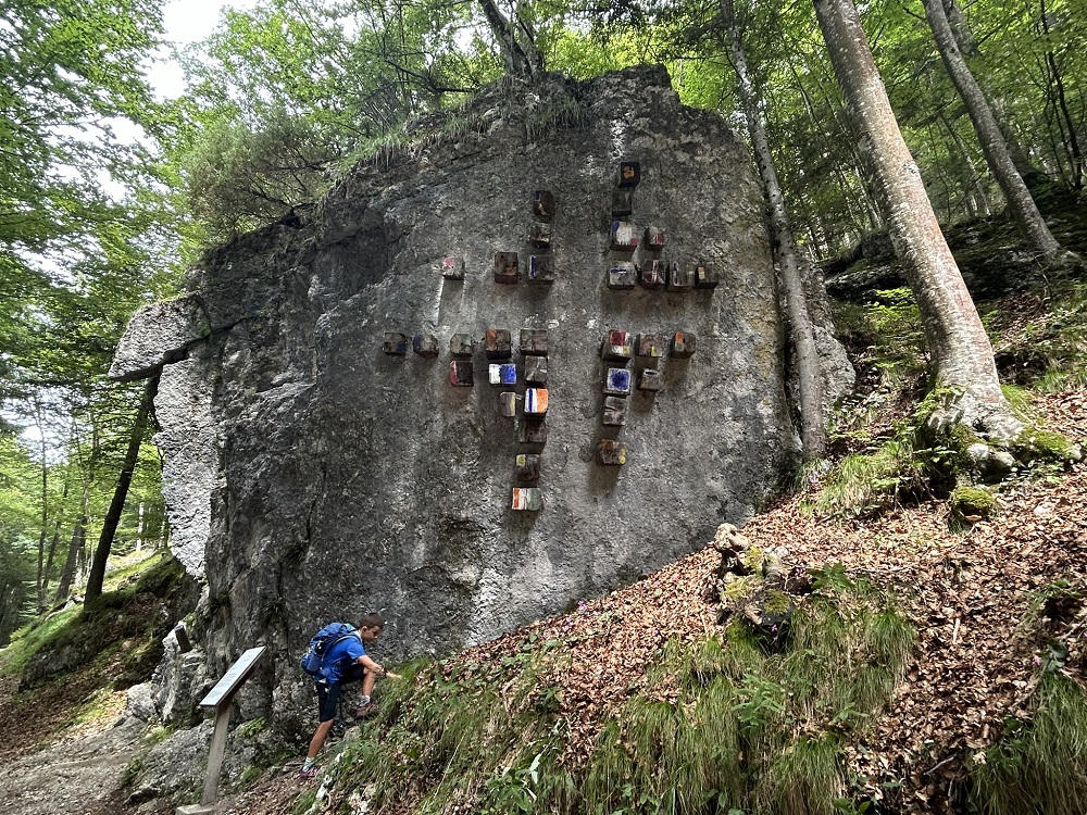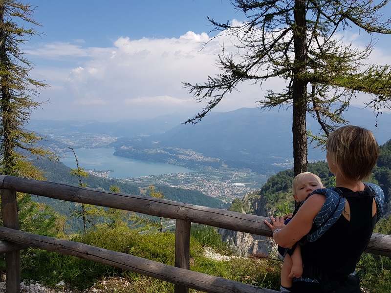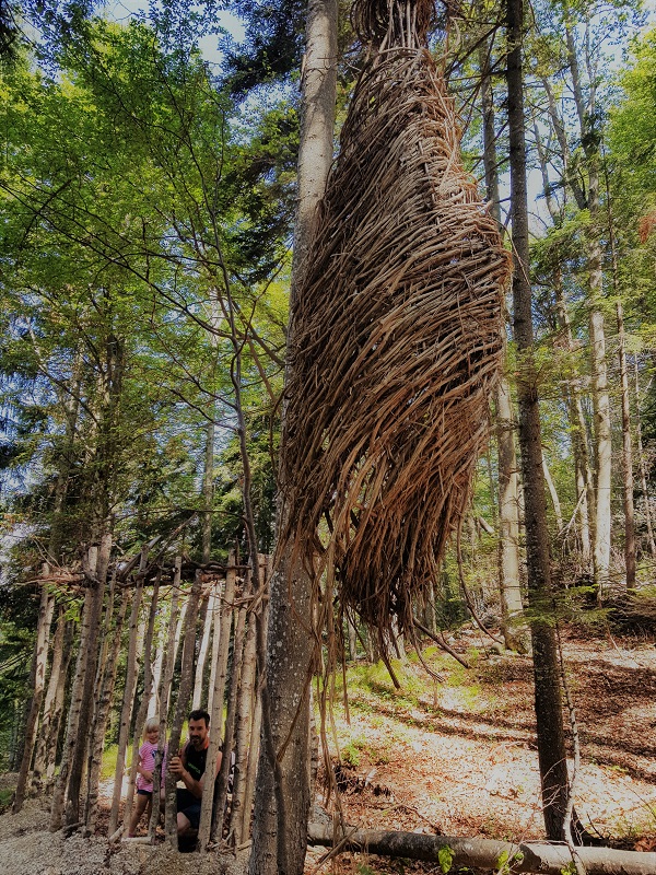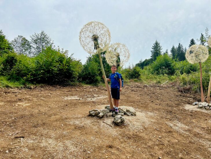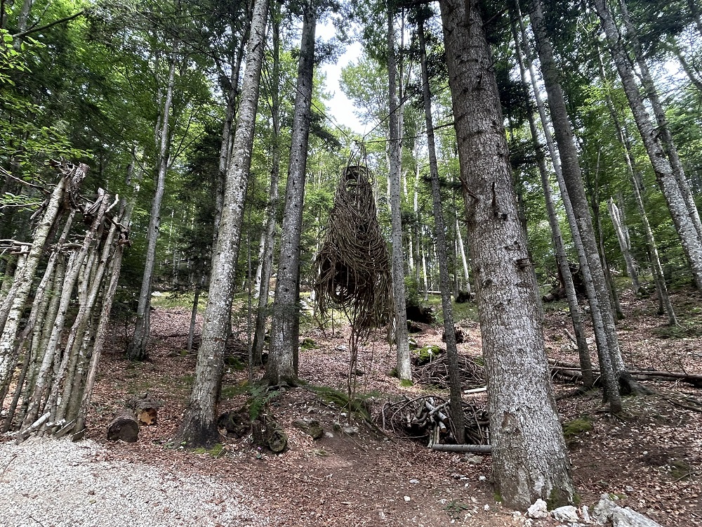 Sono due chilometri e mezzo in leggerissima salita (cento metri di dislivello). Strada forestale, comoda, percorribile con i passeggini da trekking, completamente ombreggiata. Dalla terza opera in poi, siamo rimasti incantati, divertendoci a trovare i titoli che avevano dato gli artisti… un bello sforzo di immaginazione anche per i più piccoli! Attorno solo silenzio e quiete, e la Vigolana a fare da vedetta.