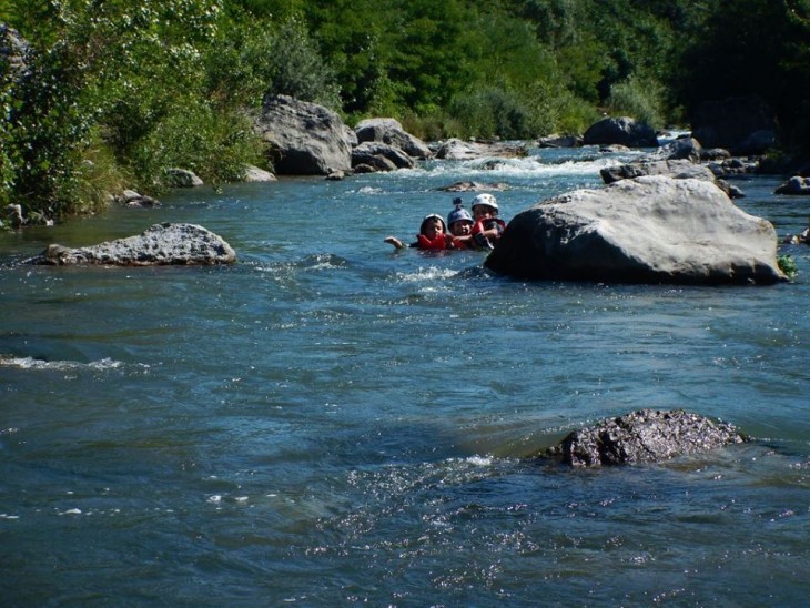 Il tempo di un breve briefing sulla sicurezza (quando si cammina, quando ci si sdraia, come si affrontano certi punti, che posizione corretta assumere…), un tratto di prova (“sedere in alto, mani che spingono in basso il salvagente, piedi a martello per incontrare dolcemente i sassi che affiorano di più sul pelo dell’acqua”) ed eravamo pronti per lasciarci trasportare dalla corrente, e camminare nel modo “giusto” nei punti dove l’acqua è più bassa.