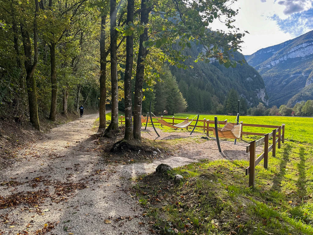 La prima stazione è quella dei Gusci: tre amache in legno, che permettono di rilassarsi nella natura. Attorno il bosco e verdi prati.