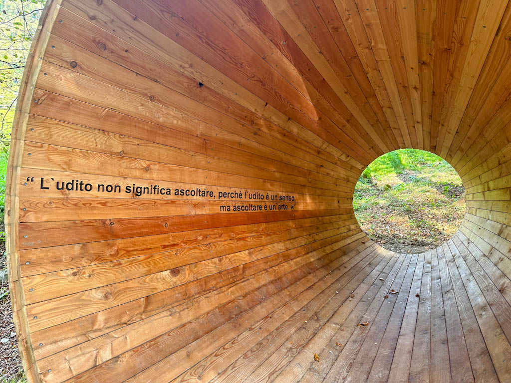 Quarta tappa il Tappeto sospeso, che altro non sarebbe che alcune piattaforme in legno, magari per una sosta pic nic. C’è poi la Nuvola sonora, composta da un’opera sospesa che vede pezzi di legno e di ferro da “suonare”.
