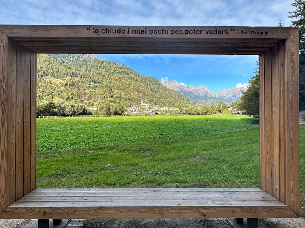 Facendo qualche passo ancora si arriva alla cornice, che focalizza l’attenzione sulle Pale di San Martino: “Io chiudo gli occhi per poter vedere”, affermava Paul Gauguin.