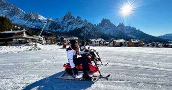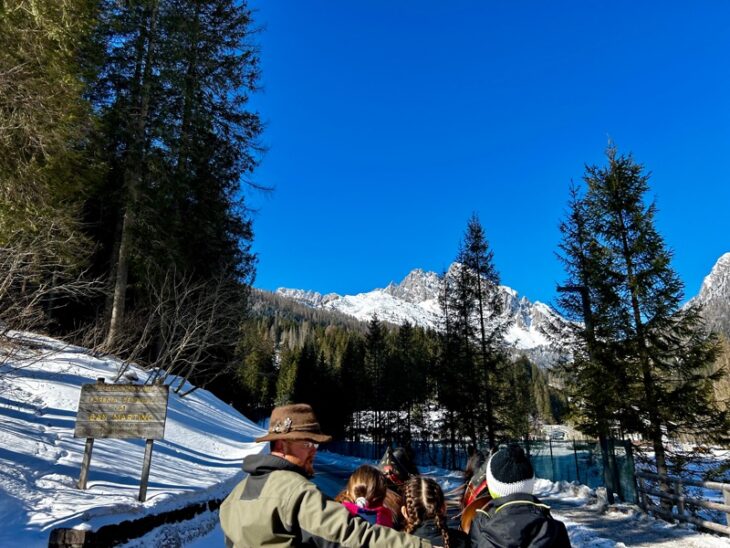 Punto di ritrovo per la partenza del giro è il parcheggio davanti al Nasse Park, in località Prà delle Nasse, comodamente raggiungibile anche a piedi dal centro del paese di San Martino di Castrozza. Il tempo di radunare tutti i partecipanti e si sale a bordo. Per tenervi belli al calduccio troverete anche delle copertine di lana da mettervi sulle gambe, cosa volere di più? E poi via che si parte. Dopo aver costeggiato il Centro Sportivo e la pista di pattinaggio si imbocca la forestale che sale nel bosco. Ancora pochi metri ed è subito ora di fare il pit stop “gomme”: le ruote vengono sollevate e la slitta è finalmente pronta ad affrontare il bosco innevato. Si scivola sulla neve candida tra gli alberi, mentre Walter ci racconta aneddoti e curiosità. I bambini adoreranno sedersi davanti e “guidare la carrozza. mentre la scodinzolante Alba preferirà seguirla correndo nella neve.