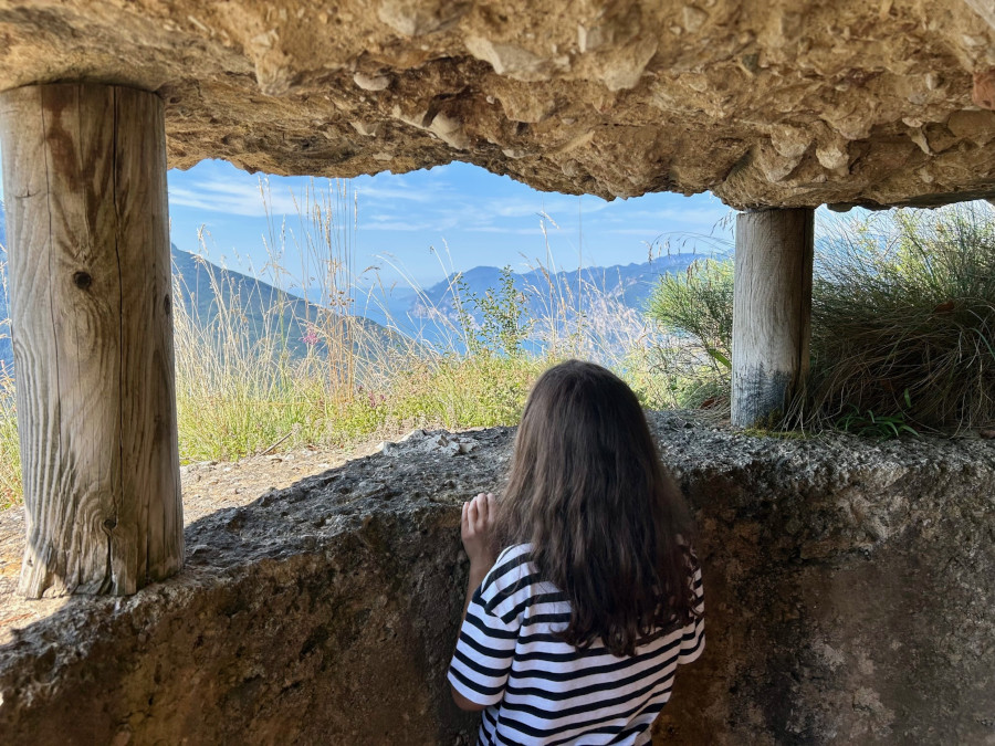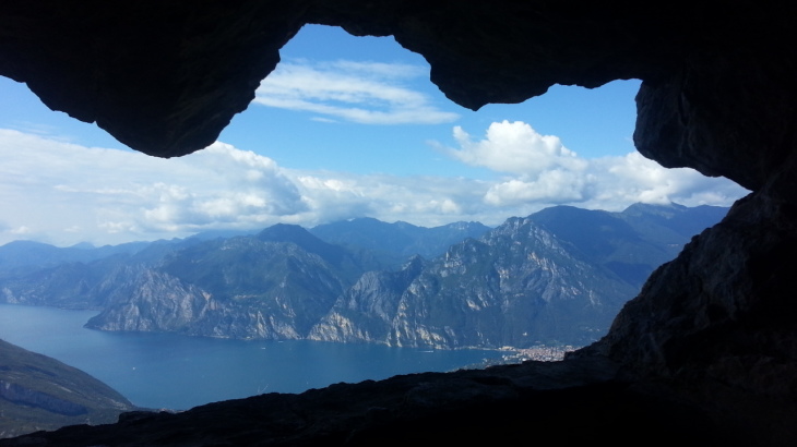 In fondo a questa grande area verde se svoltate a sinistra in brevissimo tempo vi troverete alle trincee. Il sentiero è un po stresso e scosceso, ma con un po’ di attenzione assolutamente percorribile. Ecco un balcone panoramico e un luogo davvero suggestivo: le gallerie scavate nella roccia dai soldati austroungarici, con vista mozzafiato sul lago di Garda (foto sopra, sotto e di copertina) e qualche simpatica curiosità della vita lì dentro.